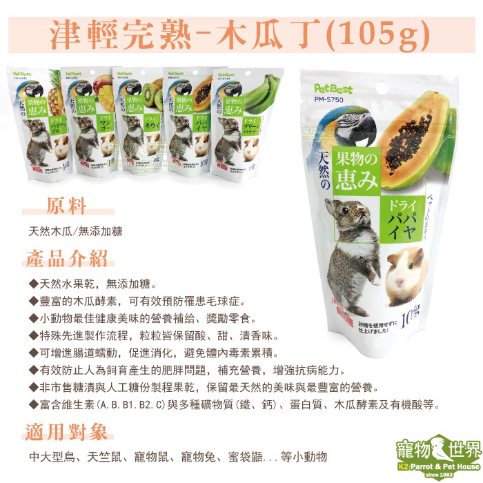 Pet Best 津輕完熟 木瓜丁105g 天然水果乾 無添加糖 小動物點心 零食 鳥 鼠 兔《寵物鳥世界》GS075