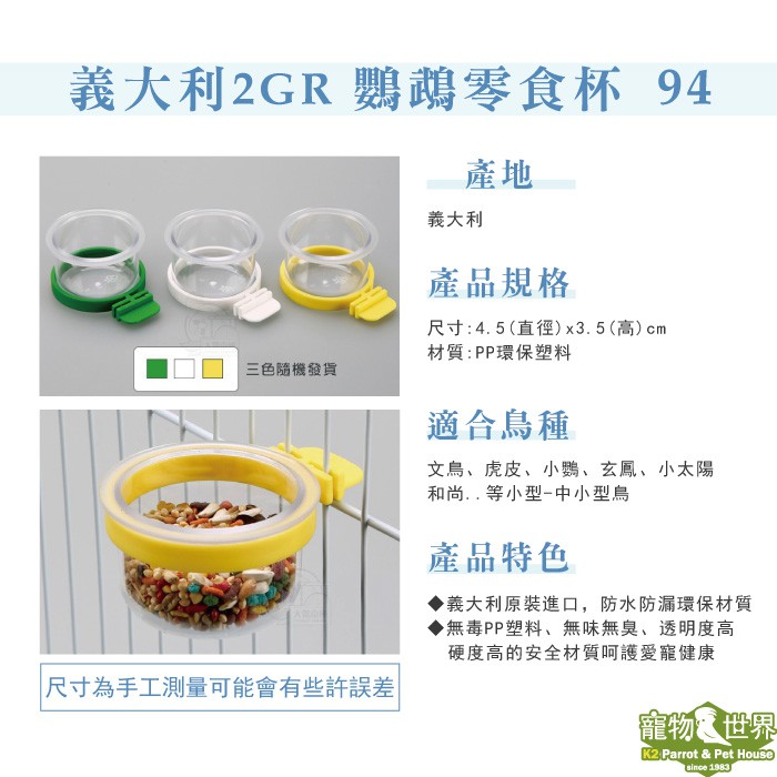 義大利2GR 零食杯/94 飼料盒 食皿 食盆 鸚鵡用品 餵食器 中小型鳥 顏色隨機《寵物鳥世界》DA0491