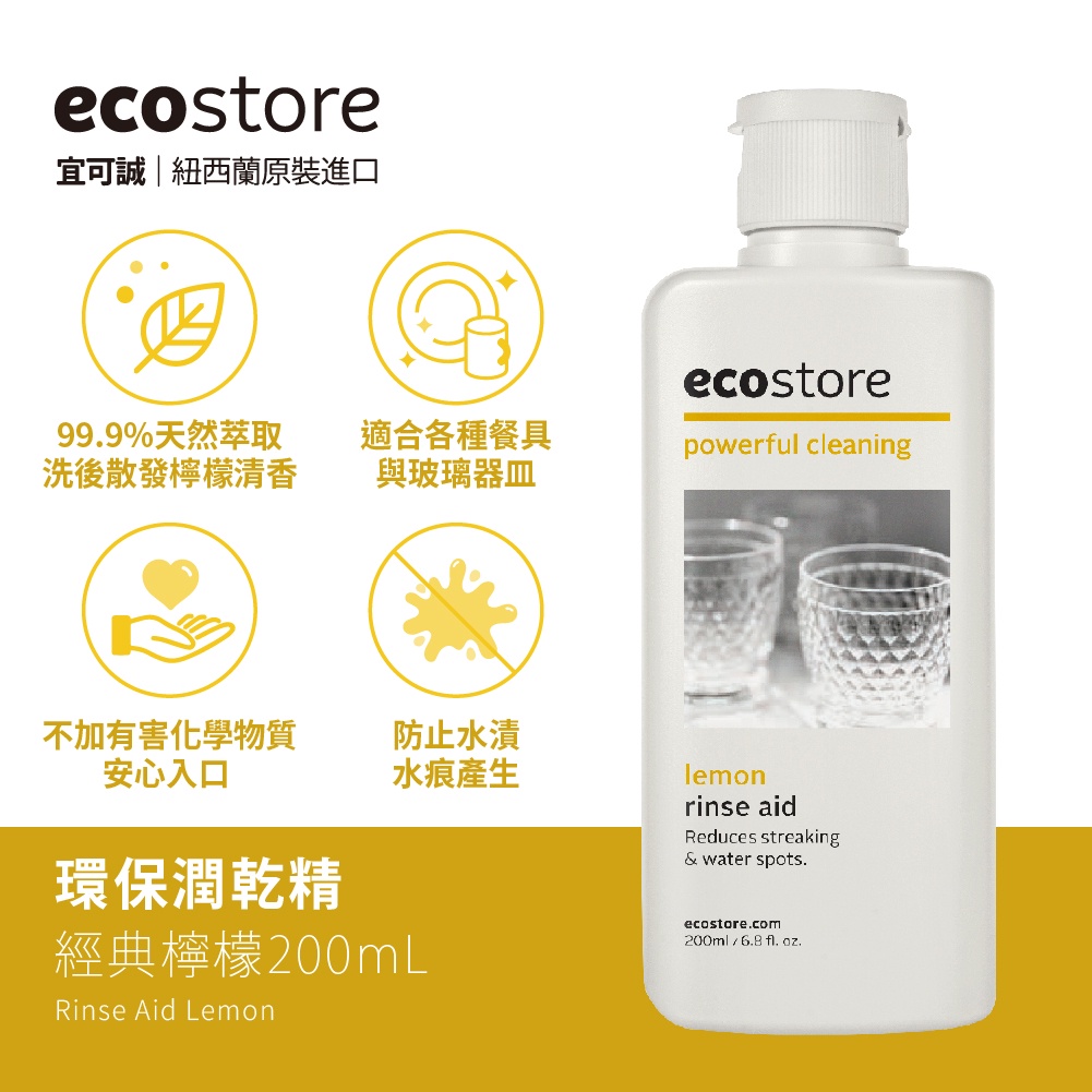 【ecostore宜可誠】洗碗機專用環保潤乾精/光潔劑-經典檸檬-200ml 不含人工色素及香精