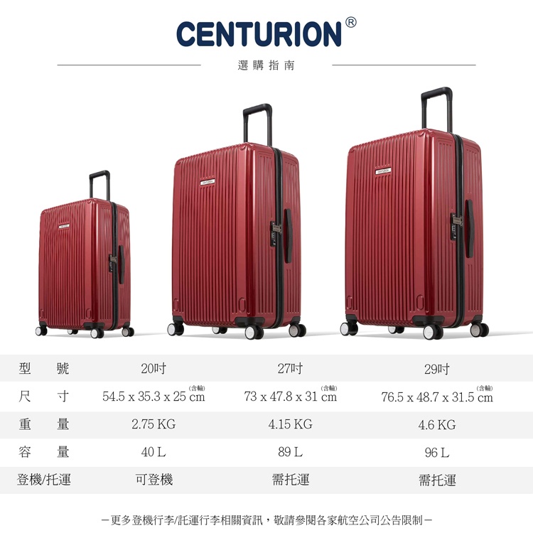 【CENTURION百夫長】紐約紅行李箱 拉鍊款 29吋 行李箱 旅行箱 出國 旅遊 國旅