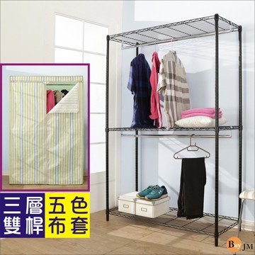 黑烤漆強固型附布套三層雙桿衣櫥(120x45x180CM)/層架(綠白直條紋)/I-DA-WA022BK-G