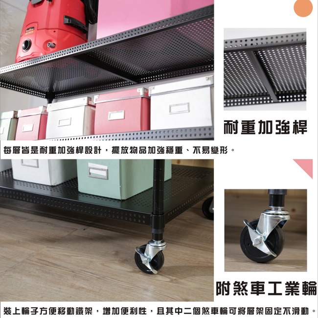 《Buy JM》鐵力士沖孔加強型黑洞洞板耐重四層置物架附工業輪+3組R-DA-SH173BK-PU