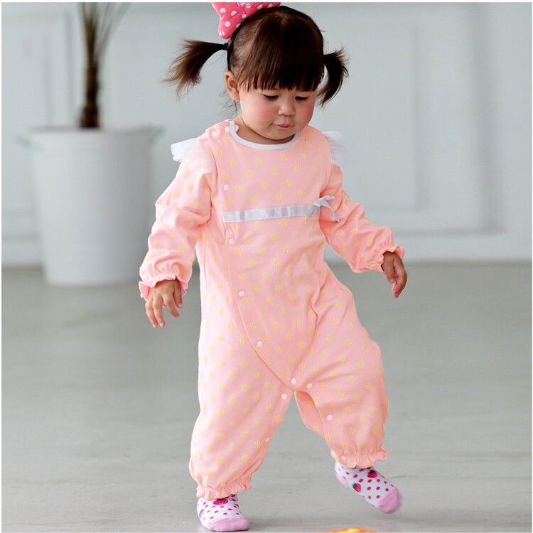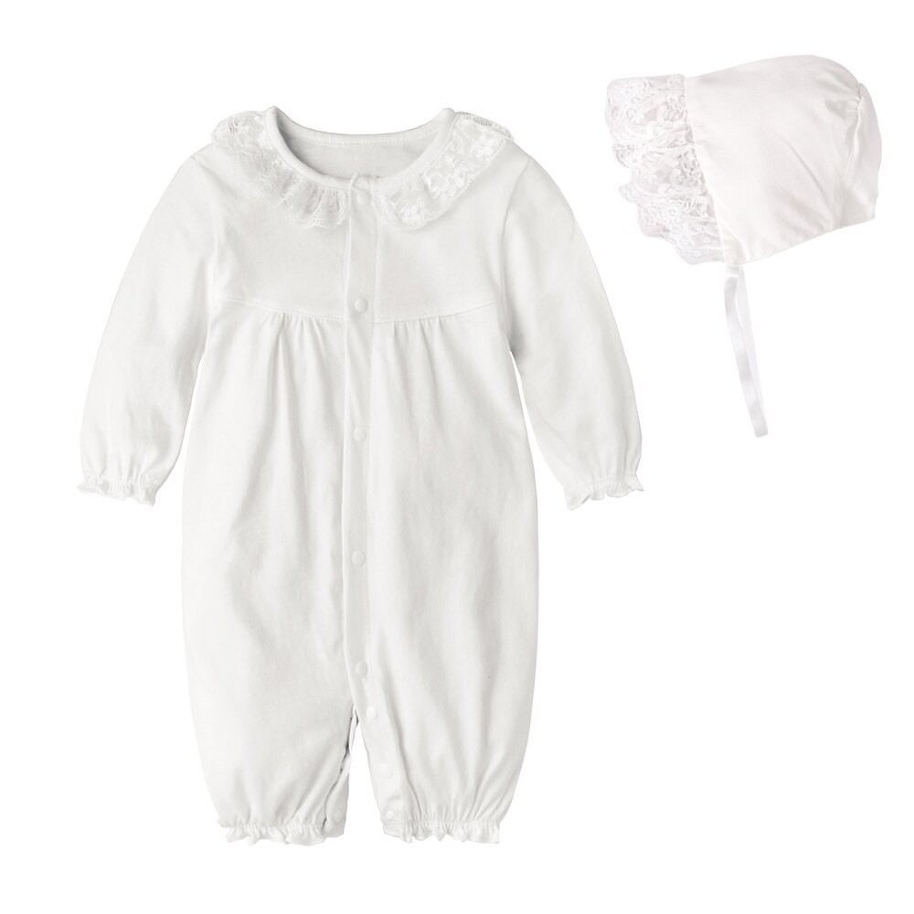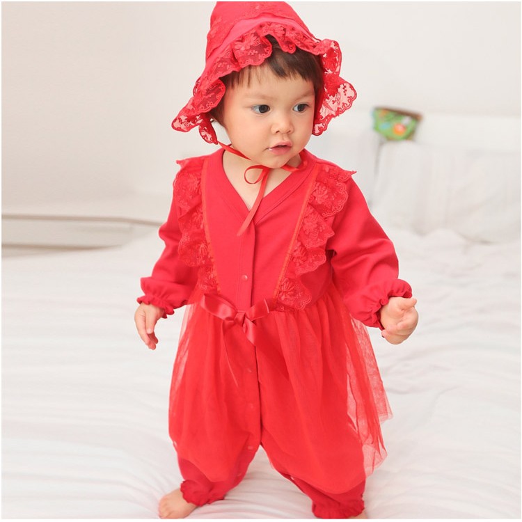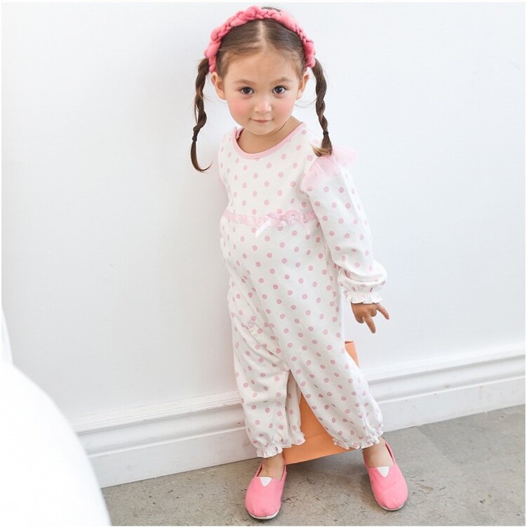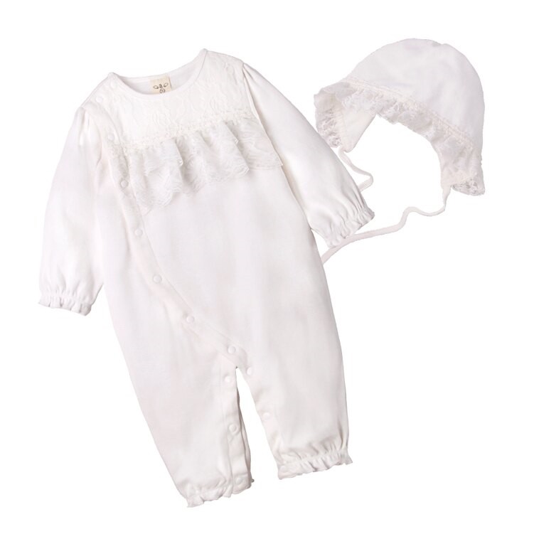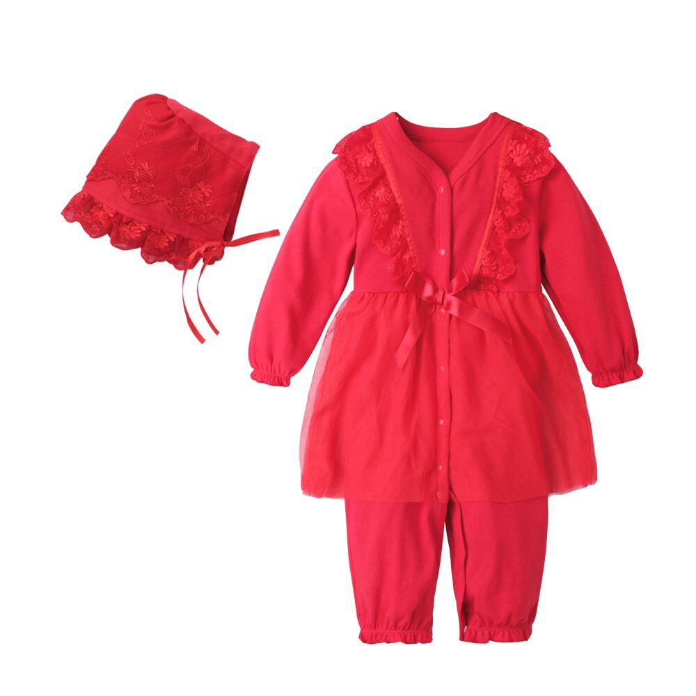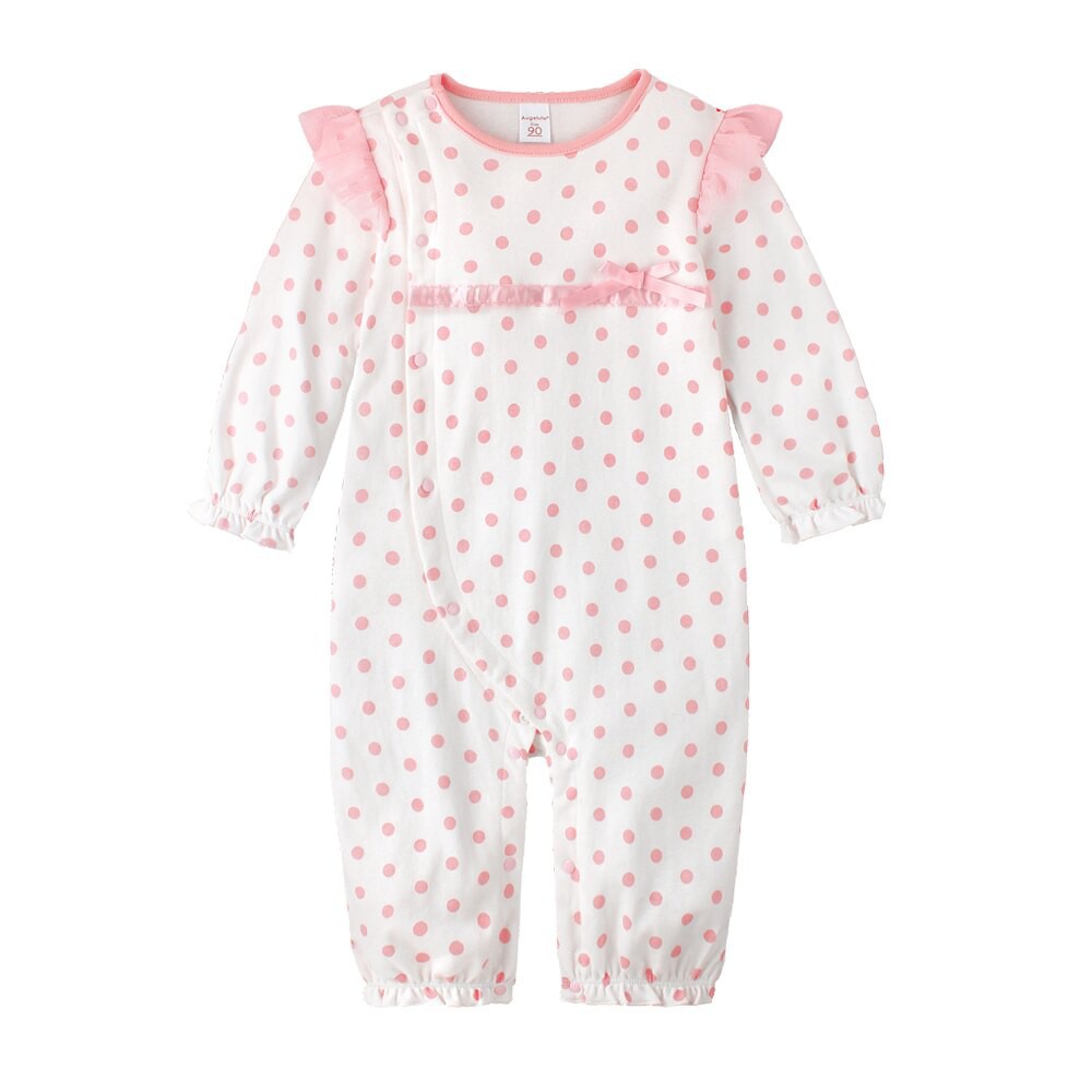 Augelute Baby童衣 女寶寶蕾絲連身衣 附帽子 點點小碎花連身衣 假兩件長袖爬服 吊帶洋裝包屁套裝 70125