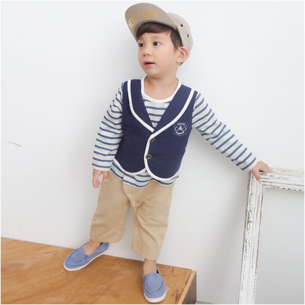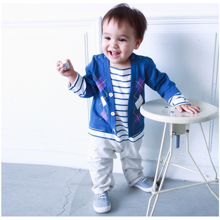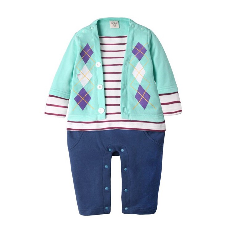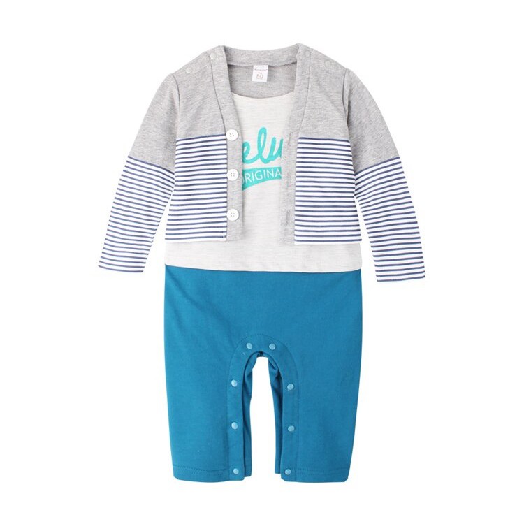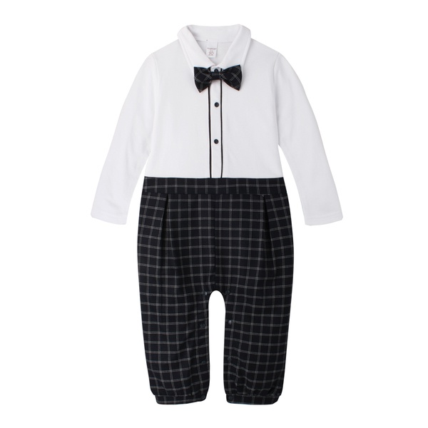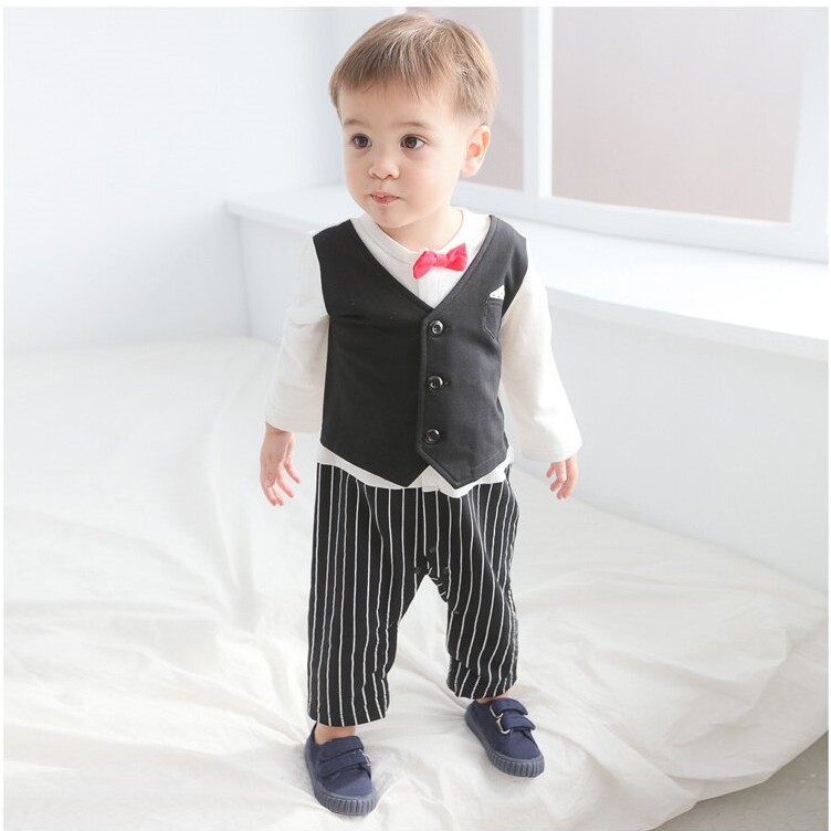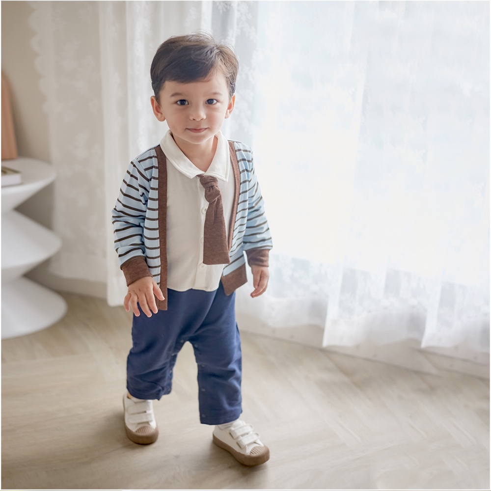 Augelute 長袖連身衣 假兩件 條紋領結男寶寶爬服 哈衣 小紳士 小花童 47151