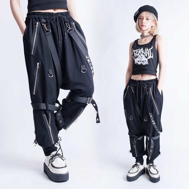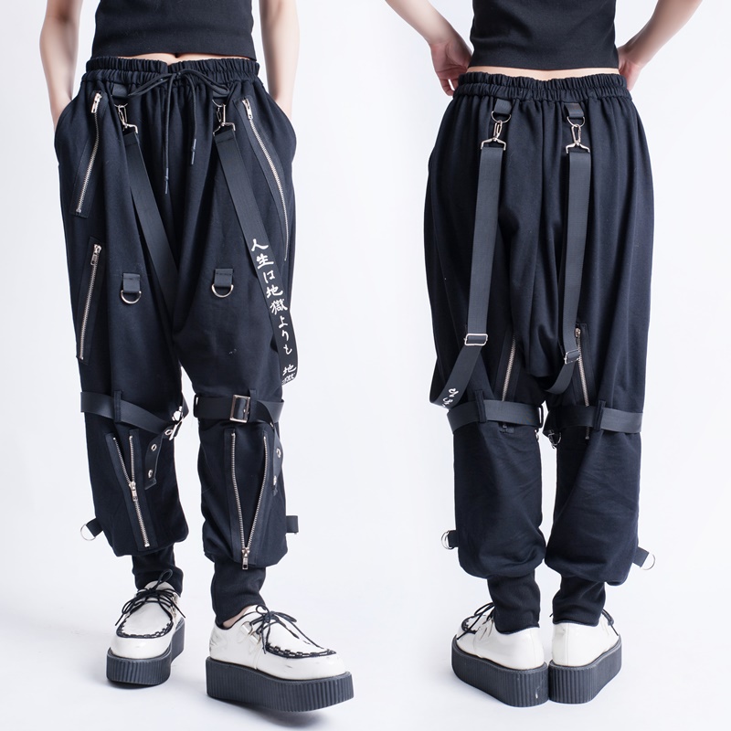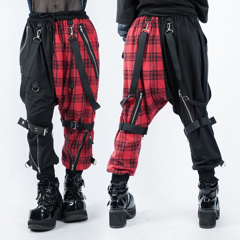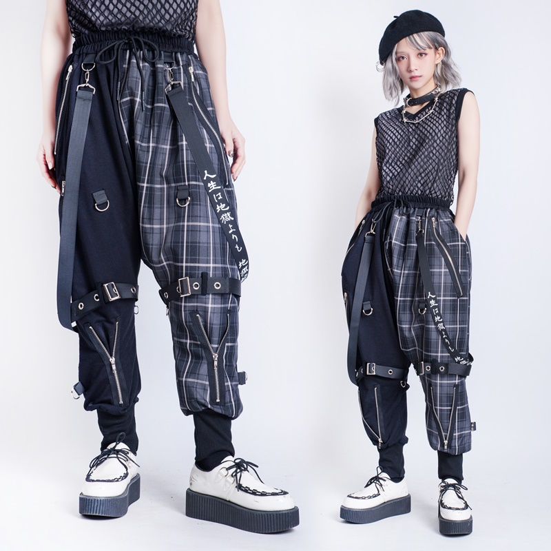 【吉兒龐克】格紋工裝織帶變形飛鼠褲(原宿街頭)|吉兒原創英式搖滾【JJ2326】