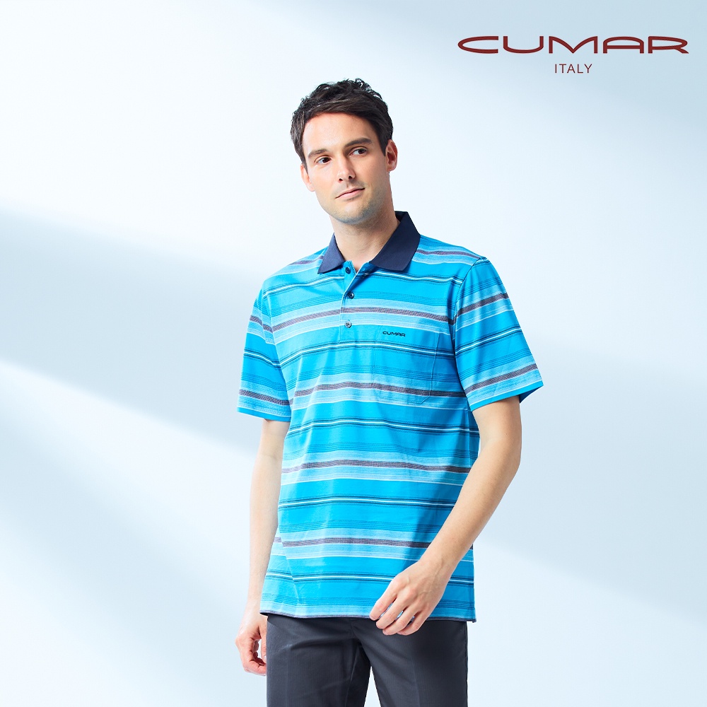 【CUMAR】男裝短袖雙絲光棉POLO衫 168234-43蔚藍條