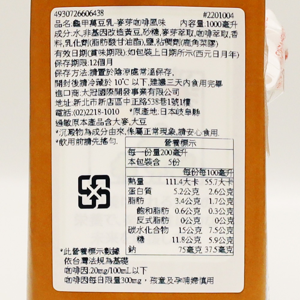 龜甲萬 豆乳 麥芽咖啡風味 1000ml【Donki日本唐吉訶德】