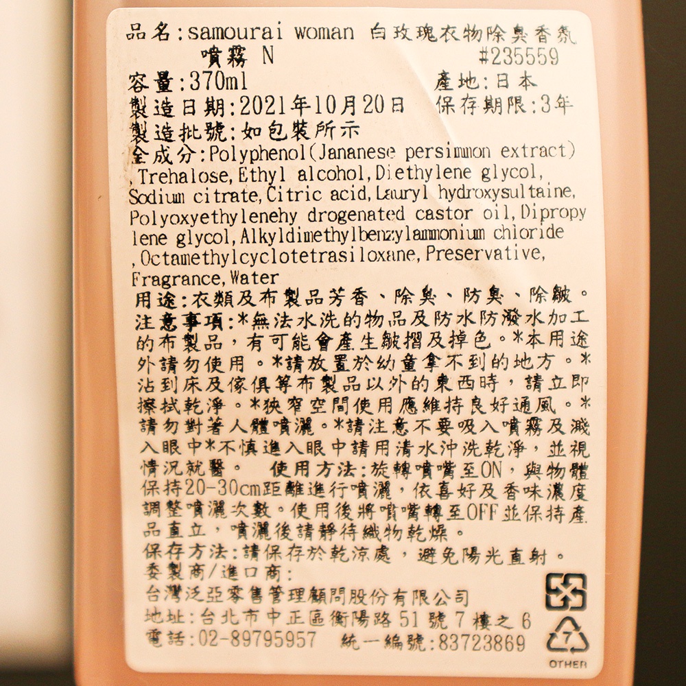 Samourai woman 白玫瑰衣物除臭芳香噴霧 370ml【Donki日本唐吉訶德】校花的味道 芳香劑