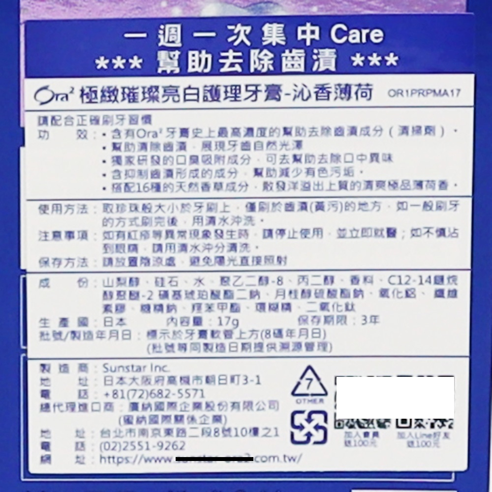 SUNSTAR Ora2 愛樂齒極緻亮白護理牙膏(沁香薄荷) 17g【Donki日本唐吉訶德】