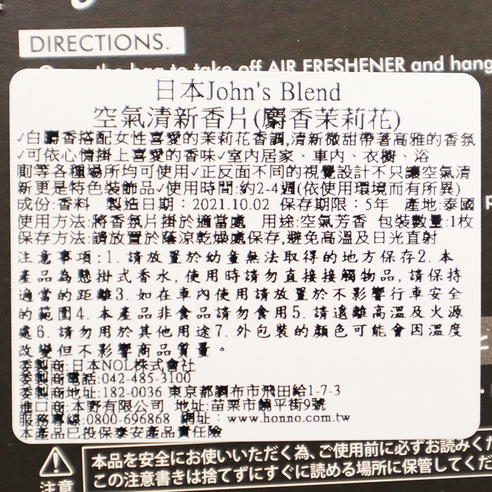 John's Blend 空氣清新香片-麝香茉莉花 1枚【Donki日本唐吉訶德】