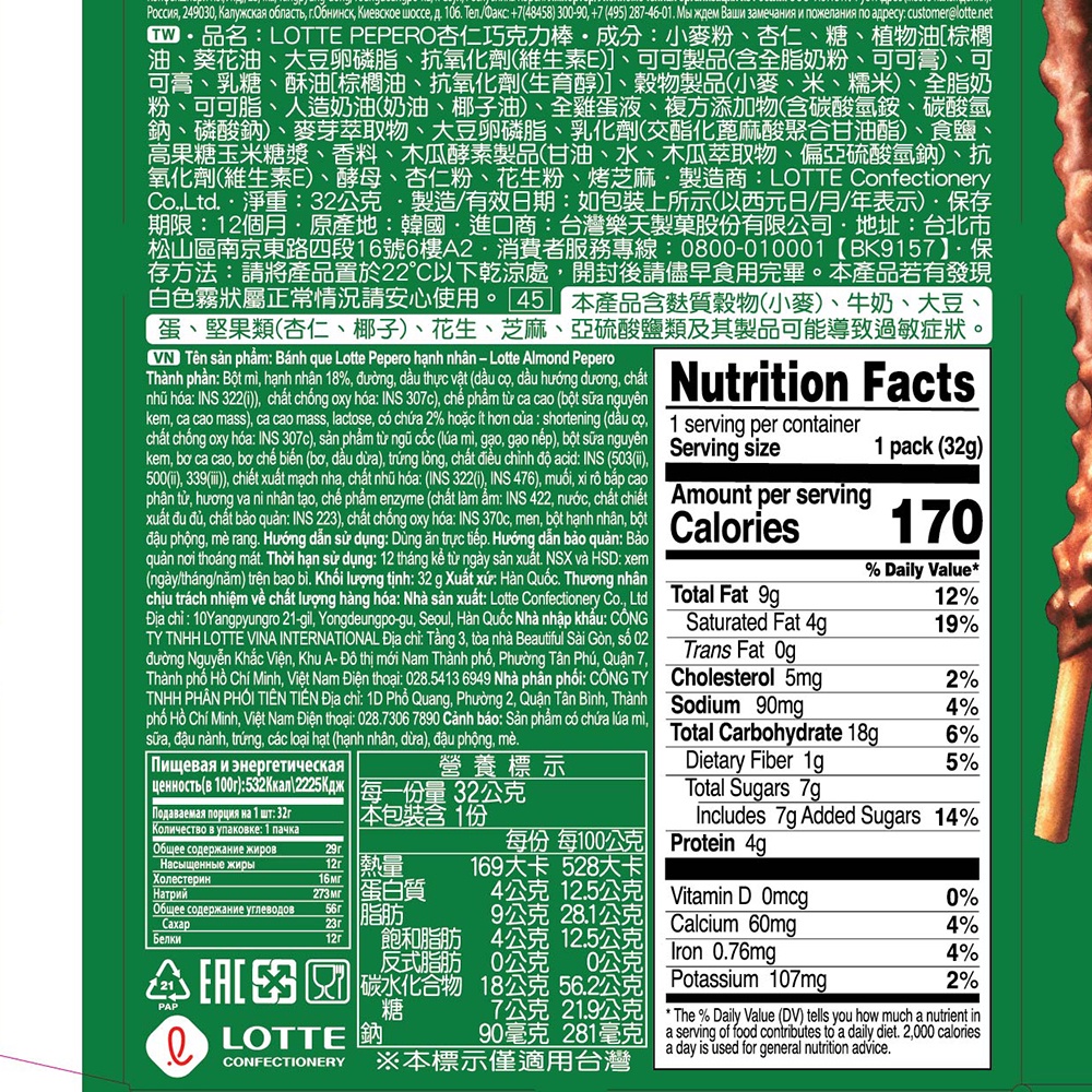 LOTTE樂天 PEPERO 杏仁巧克力棒 32g【Donki日本唐吉訶德】