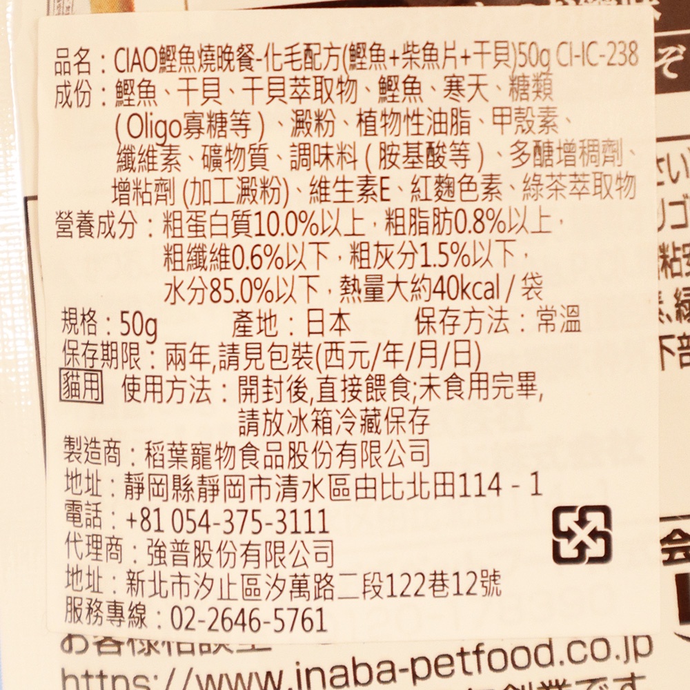 CIAO 燒晚餐包化毛配方(鰹魚+柴魚片+干貝) 50g【Donki日本唐吉訶德】