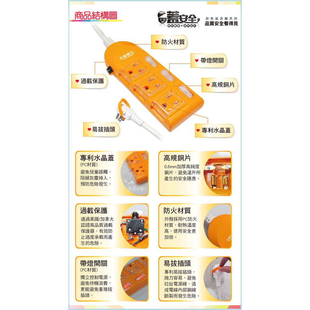 【太星電工】蓋安全 彩色電腦線三開三插((3P15A9尺))橙.紅.綠