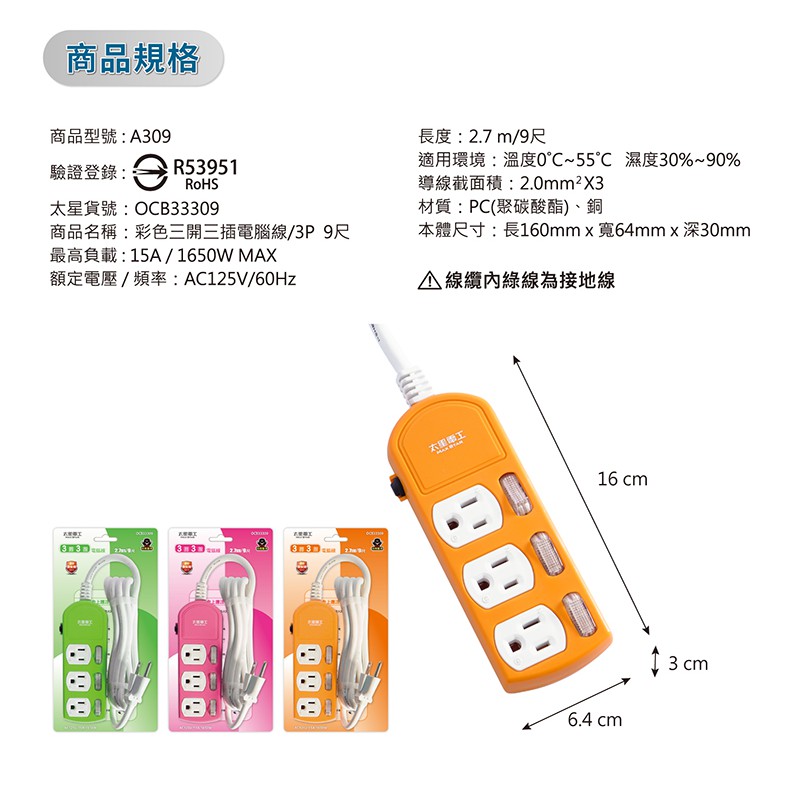 【太星電工】彩色三開三插電腦線/3P15A9尺(紅.橙.綠) OCB33309