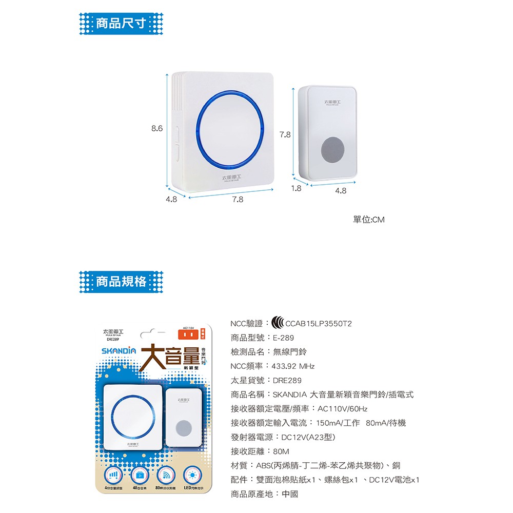 【太星電工】SKANDIA 大音量新穎音樂門鈴/插電式 DRE289