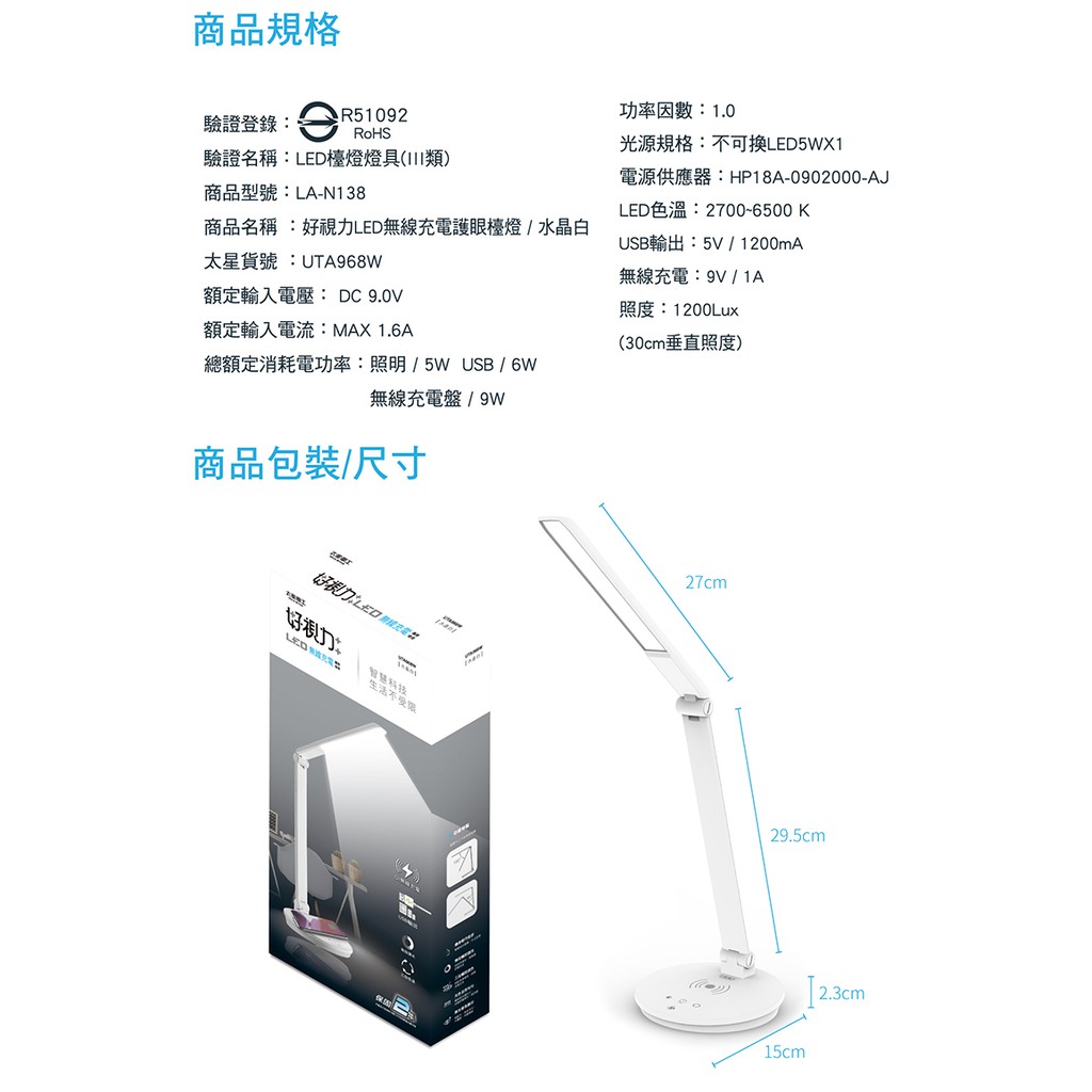 【太星電工】好視力LED護眼檯燈/5W(水晶白) 手機無線充電 UTA968W通過BSMI R51092