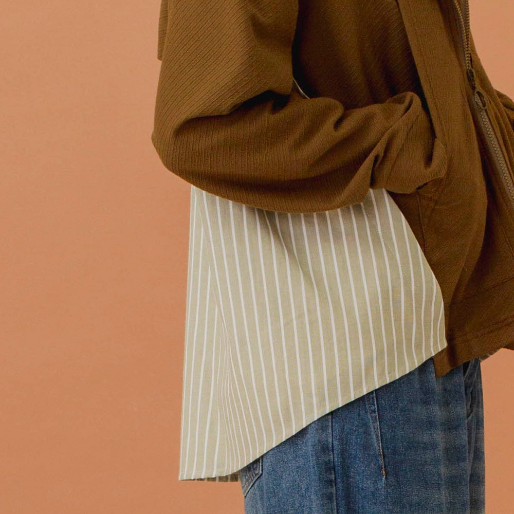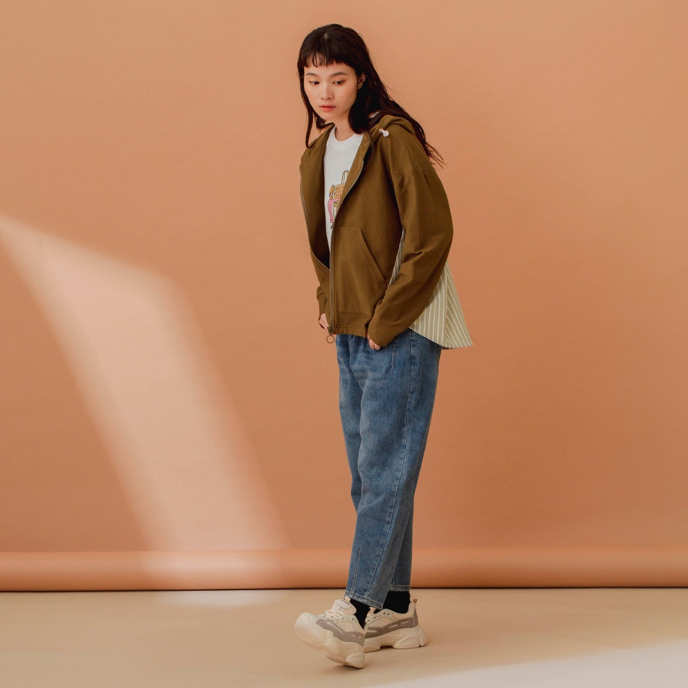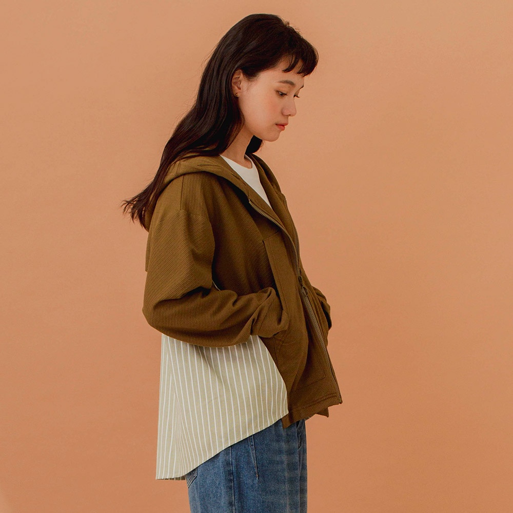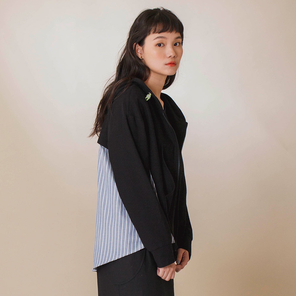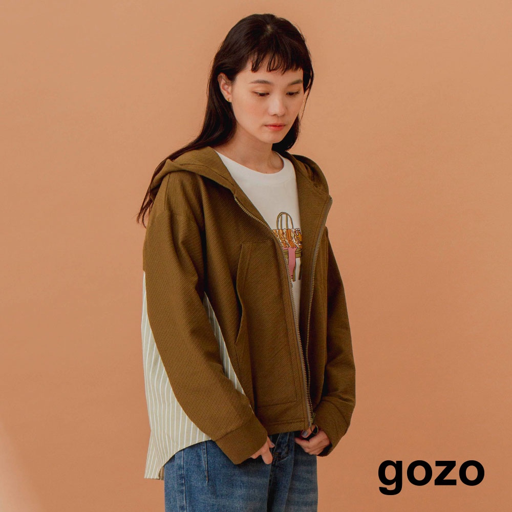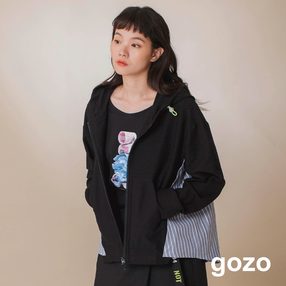 【gozo】➤條紋拼接連帽外套(黑色/深綠_F)|女裝 百搭 休閒