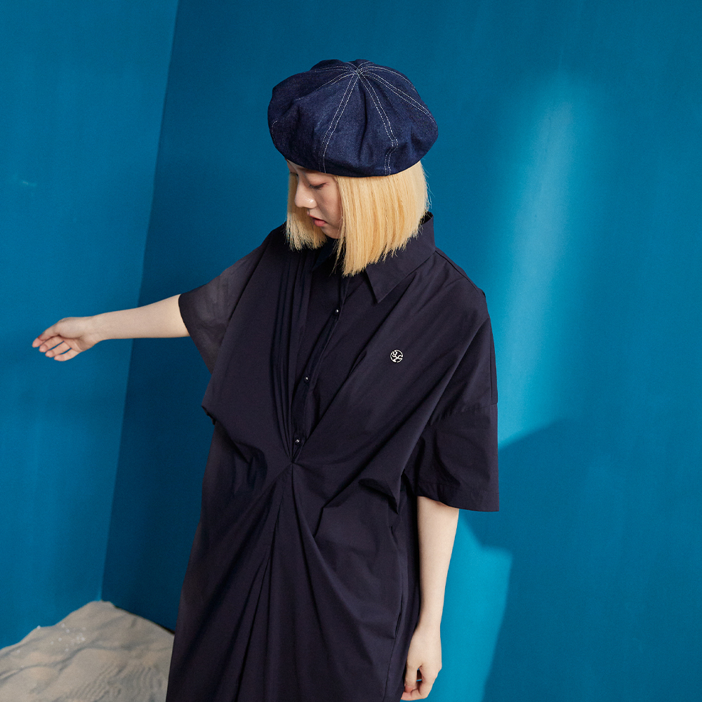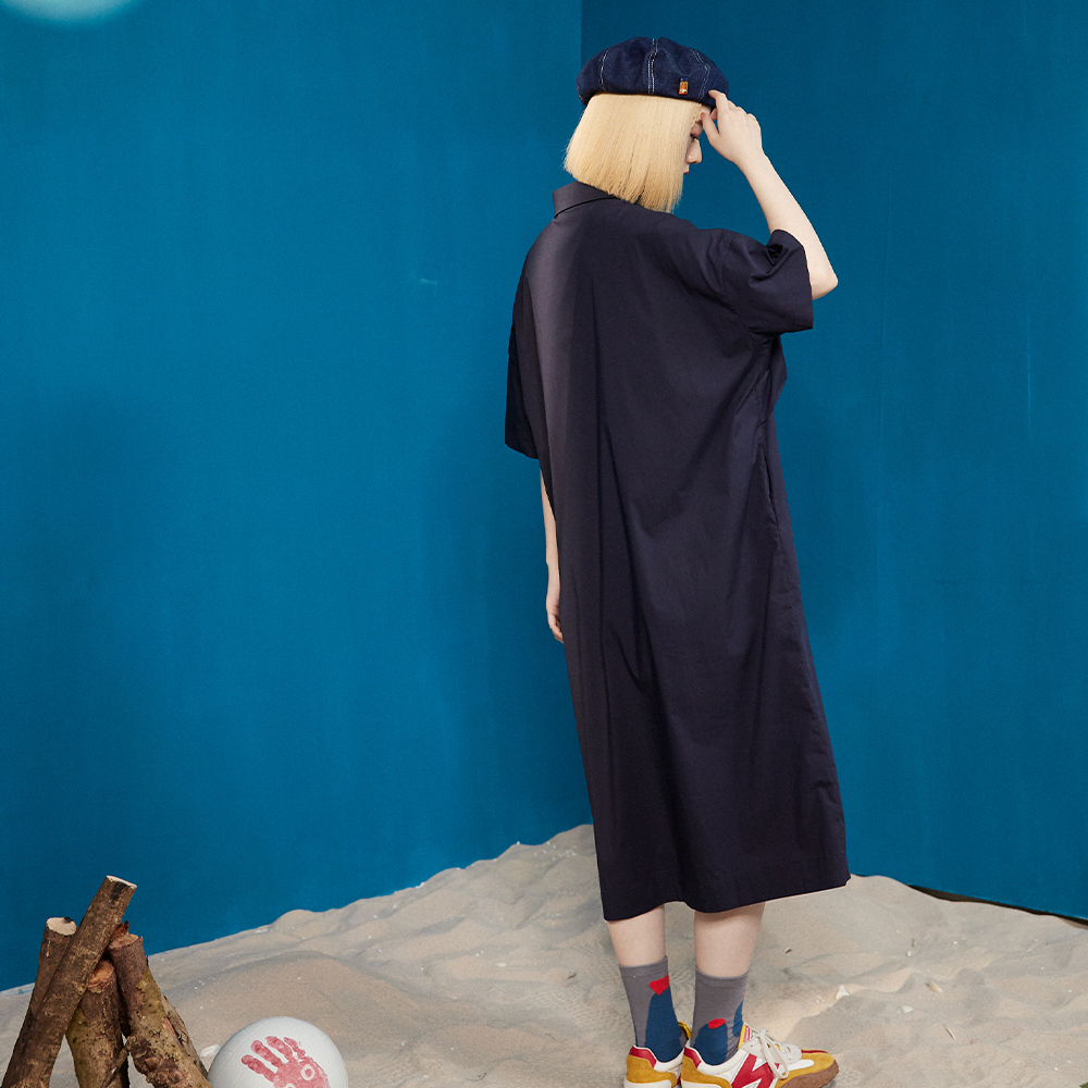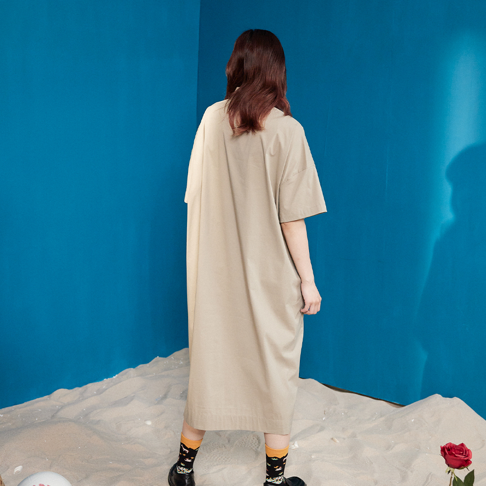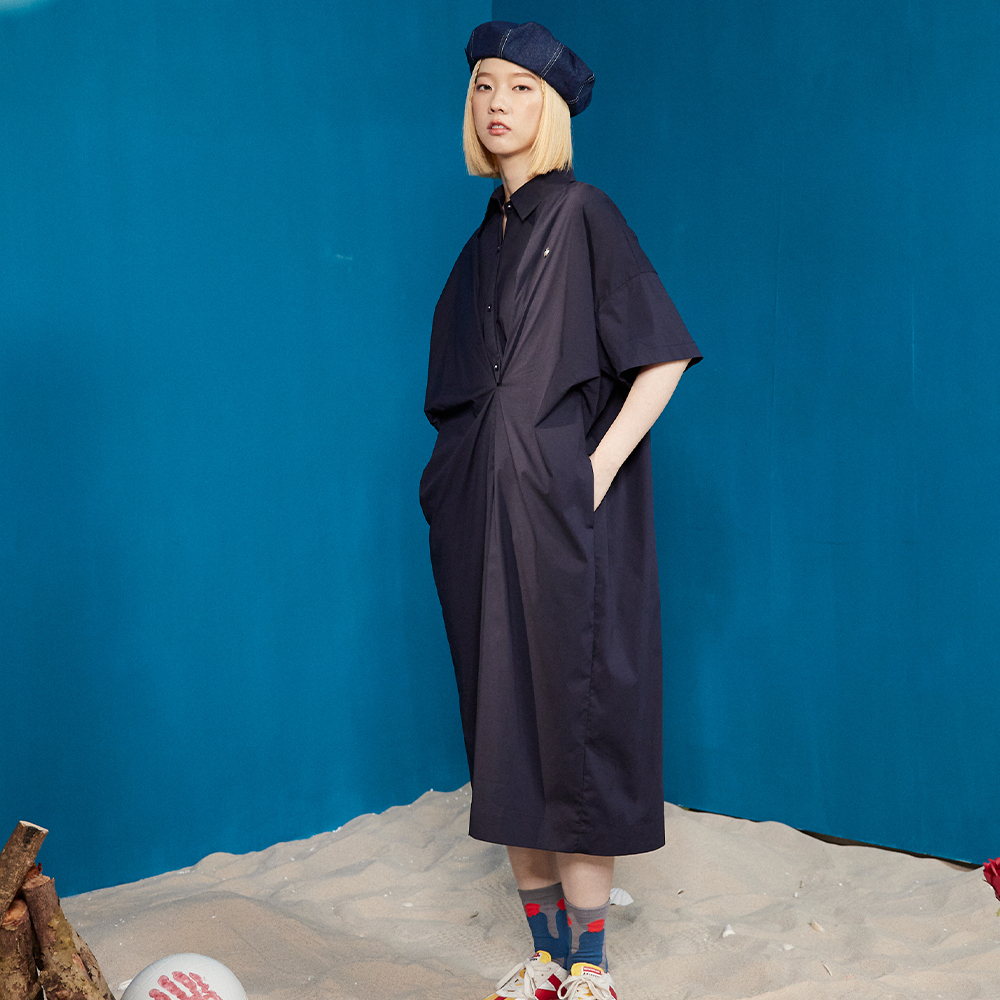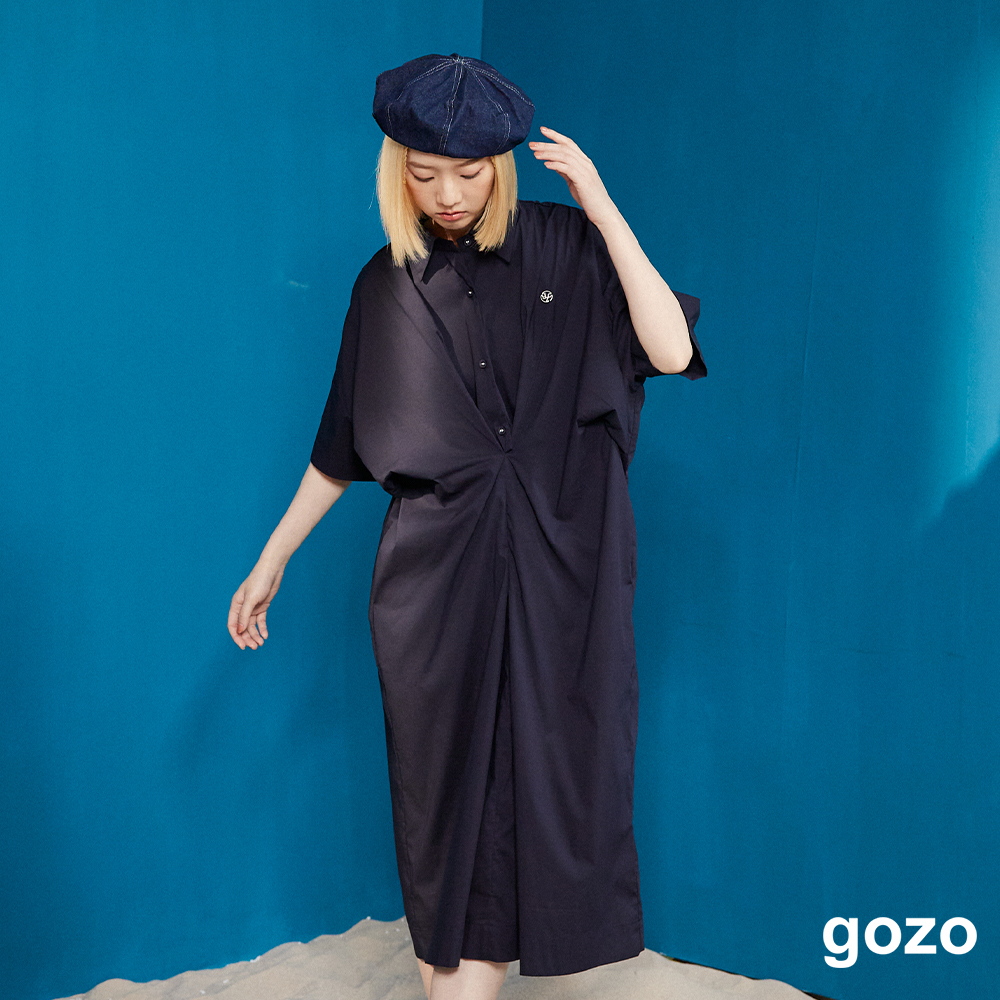 【gozo】立體抓褶造型半開襟長洋裝(深藍/淺卡其_F) | 女裝 顯瘦 百搭