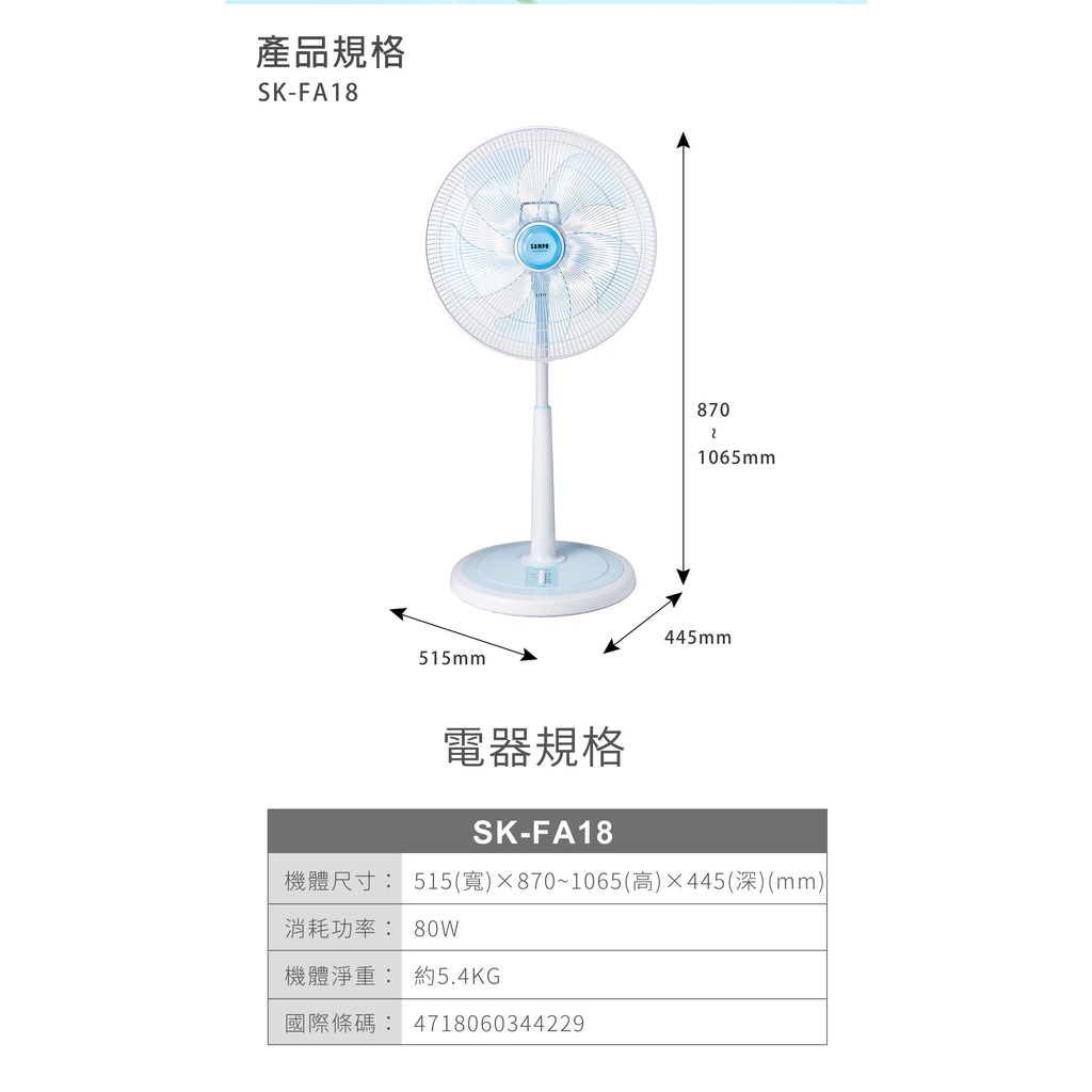 SAMPO 聲寶 聲寶K-FA18 18吋機械式立扇 綠風潮