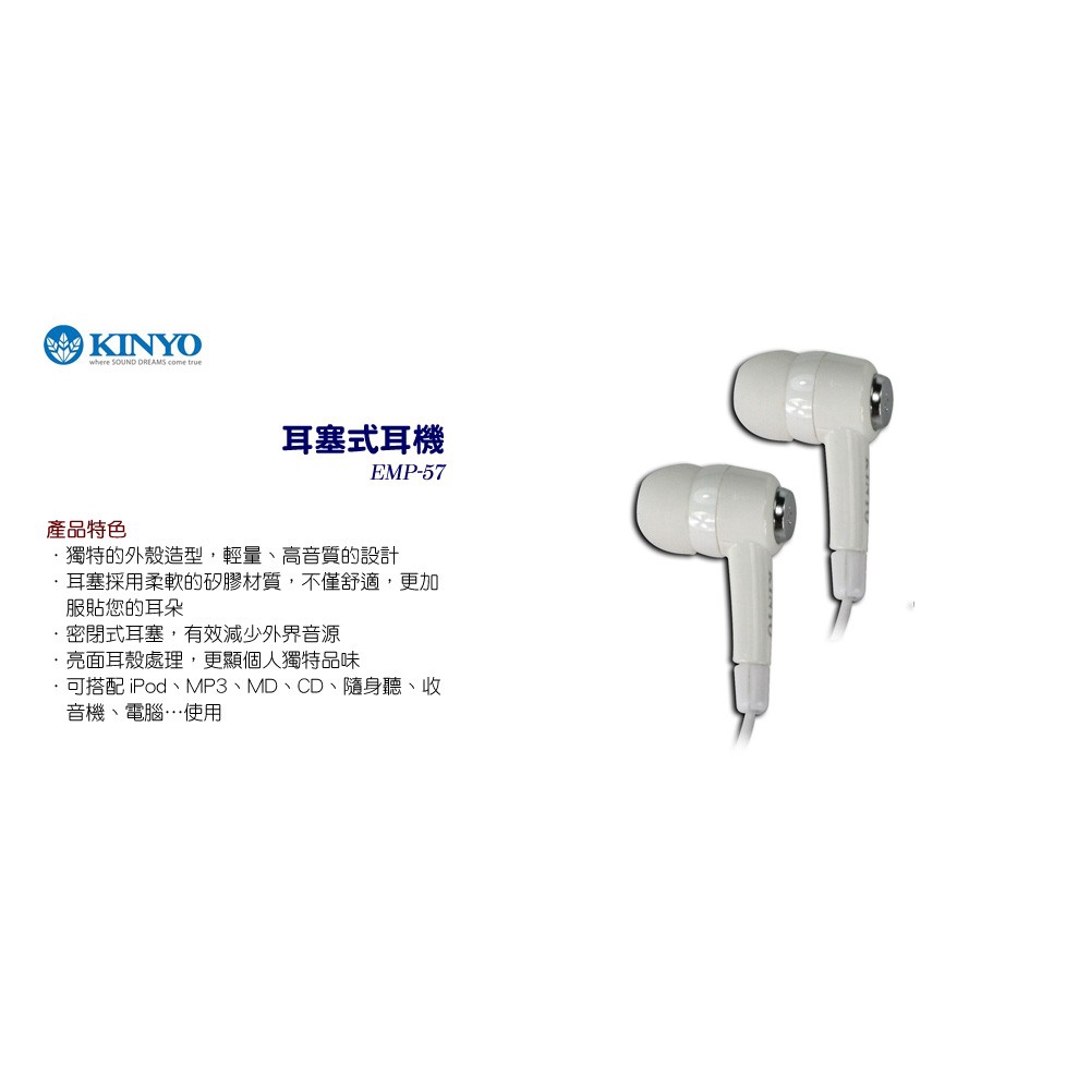 KINYO EMP-57 白 耳塞式 耳機 綠風潮