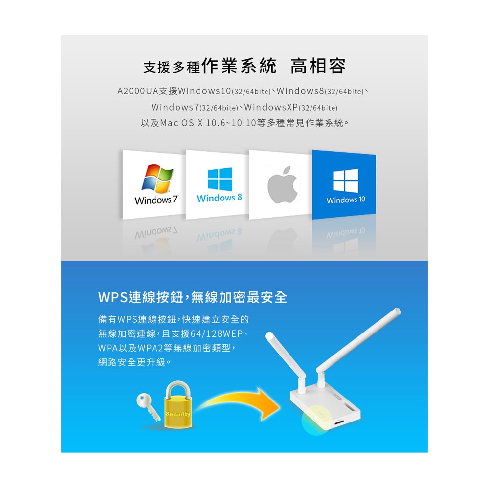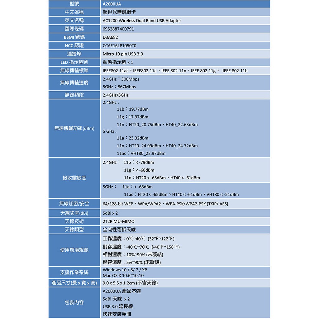 TOTOLINK A2000UA 無線網卡 300+867Mbps USB3.0 AC1200 雙頻 可拆式全向天線