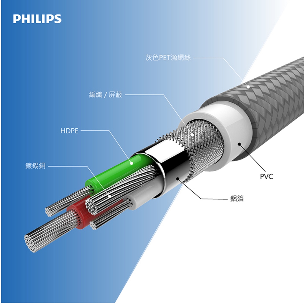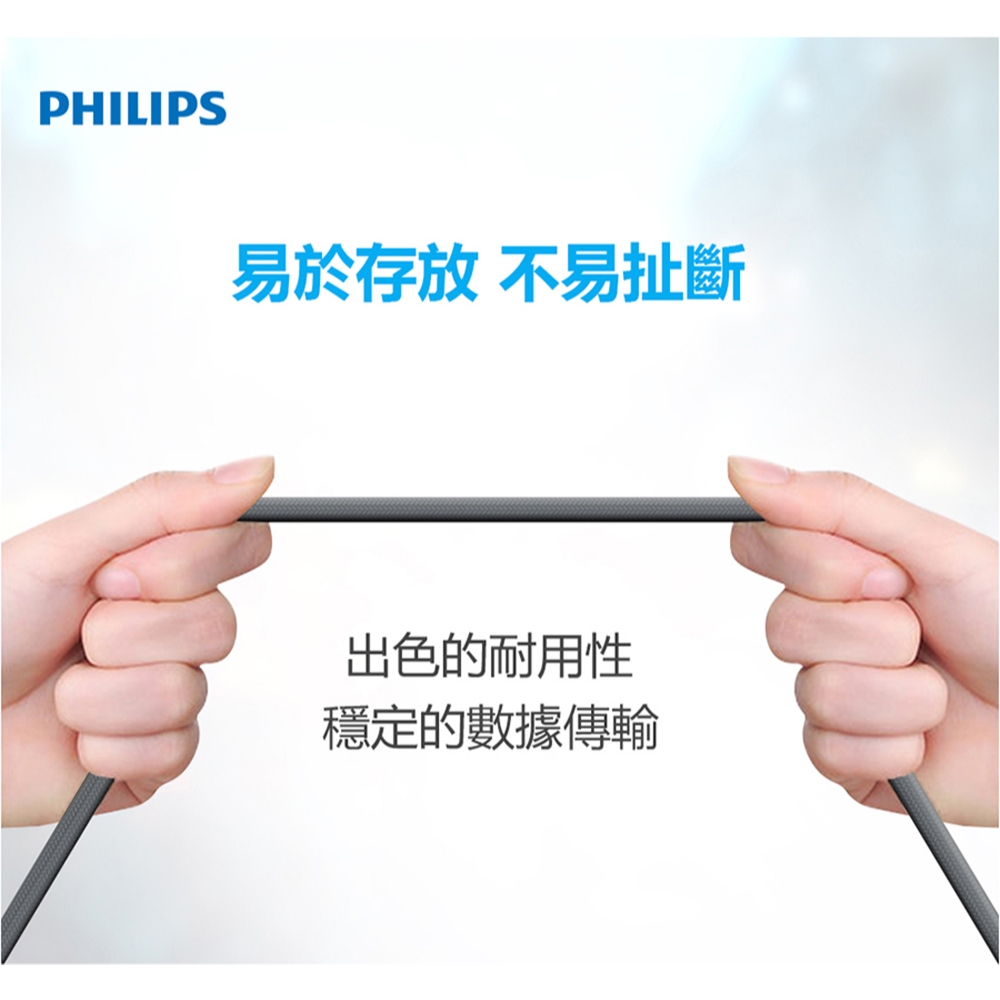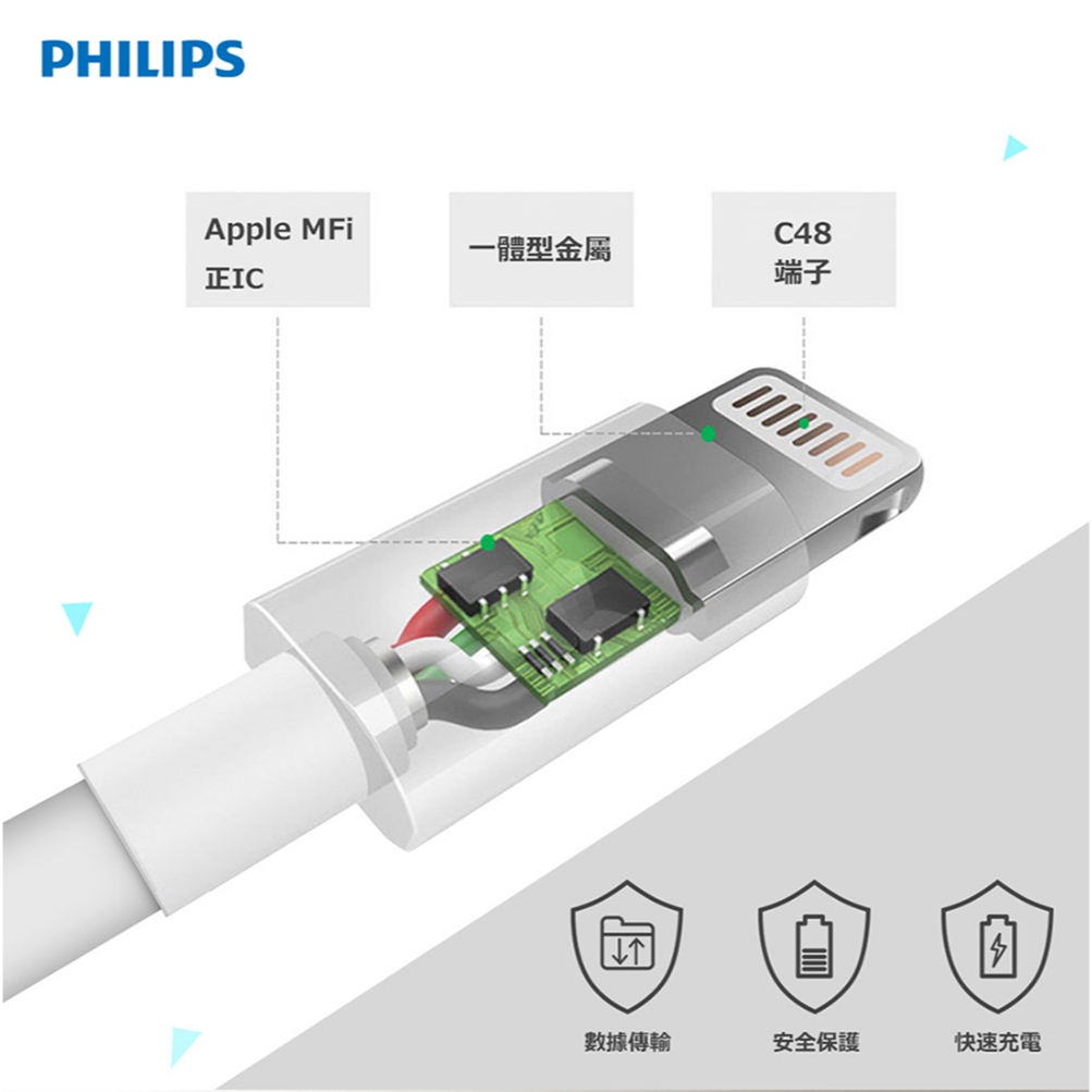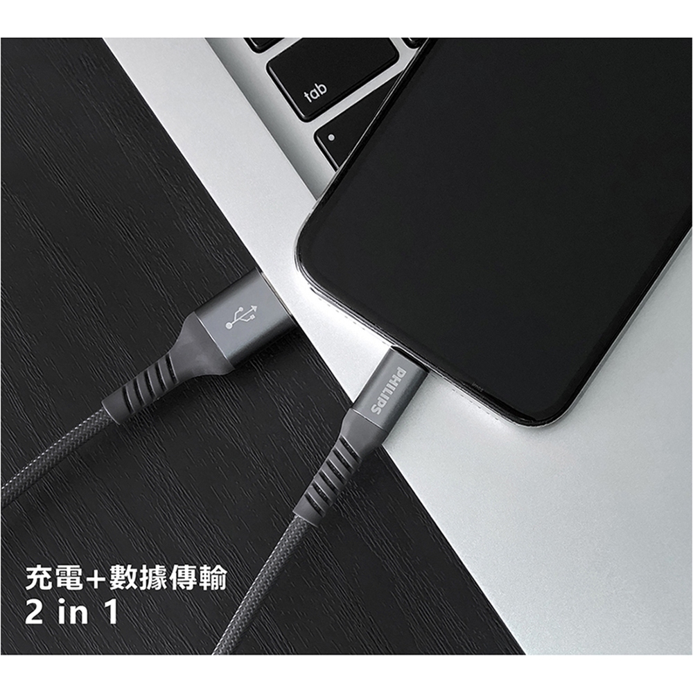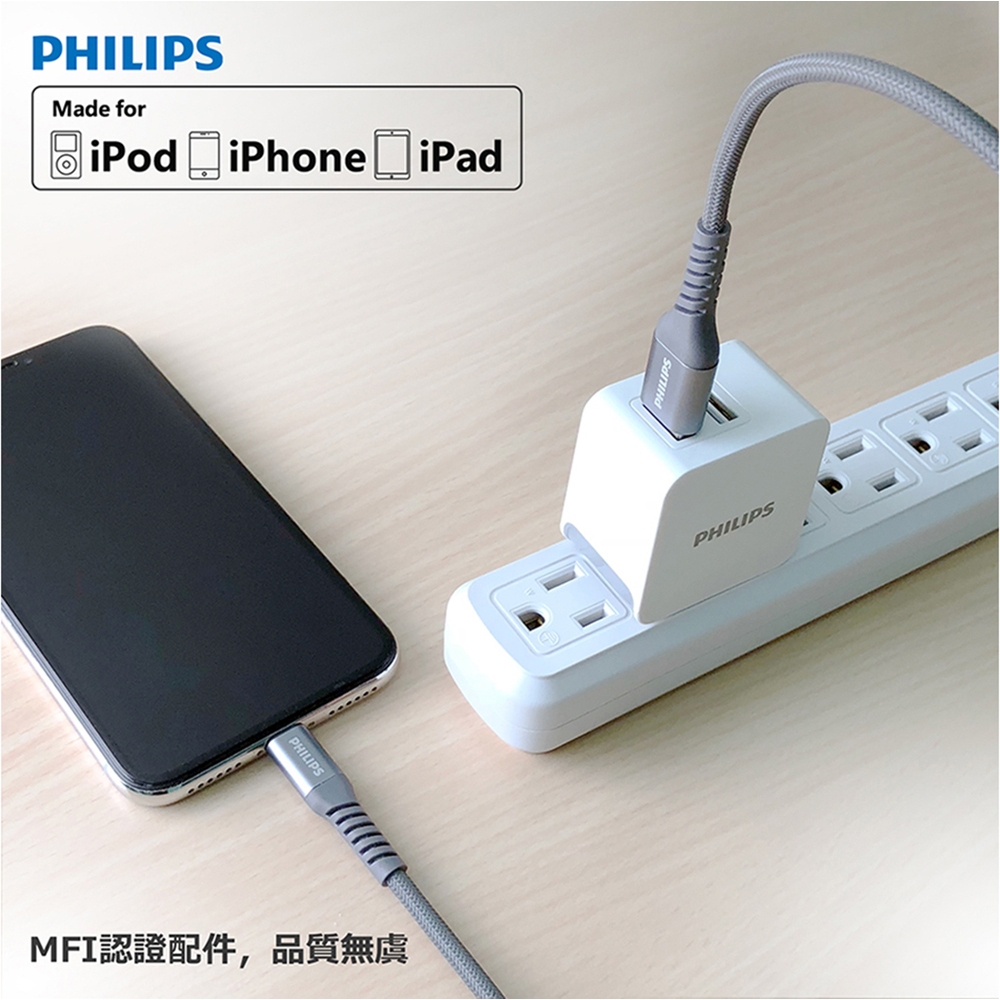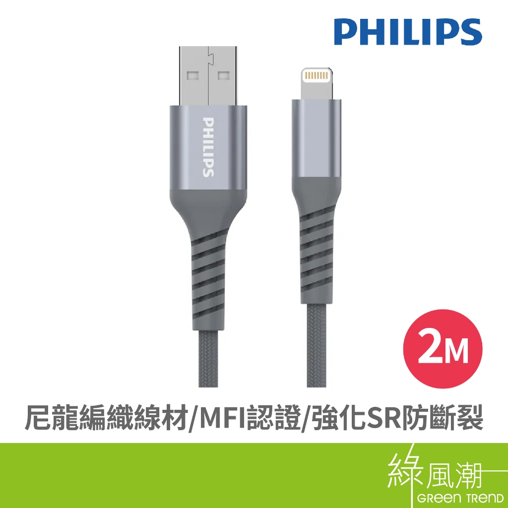 PHILIPS 飛利浦 USB to Lightning 傳輸充電線 2M Apple適用 MFI認證 尼龍編織 綠風潮