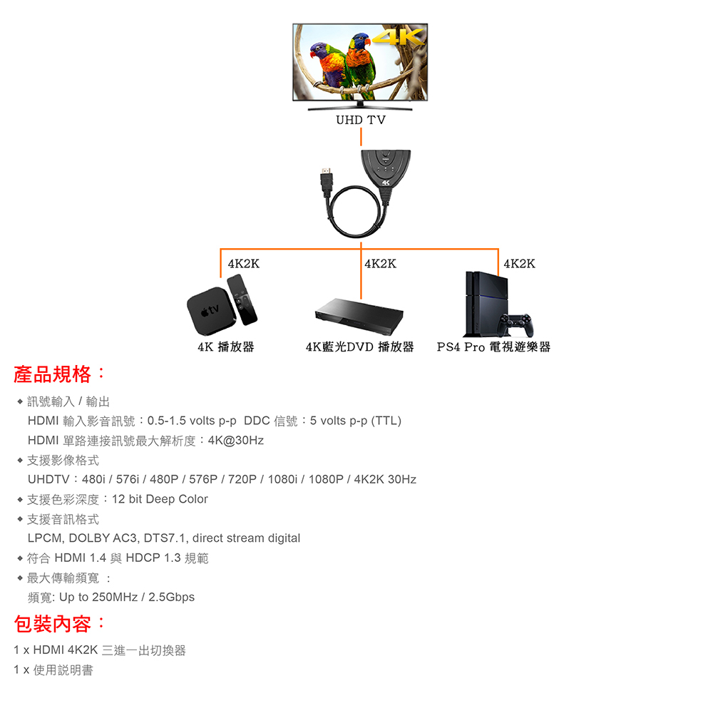 HDMI 4K2K三進一出切換器 v1.4 帶HDMI輸出 綠風潮