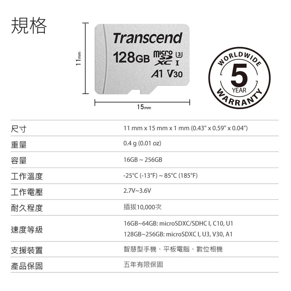 Transcend 創見 300S Micro SDXC 128G UHS-I U3 A1 V30 含轉卡 記憶卡