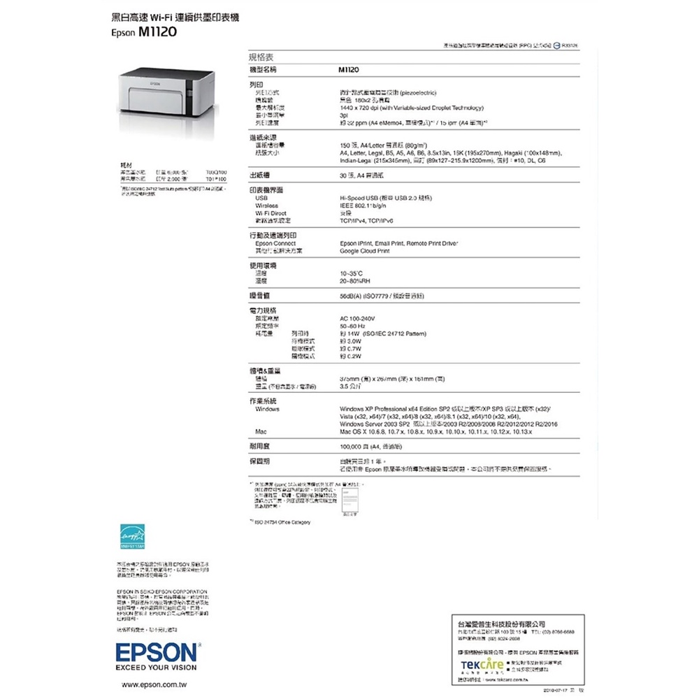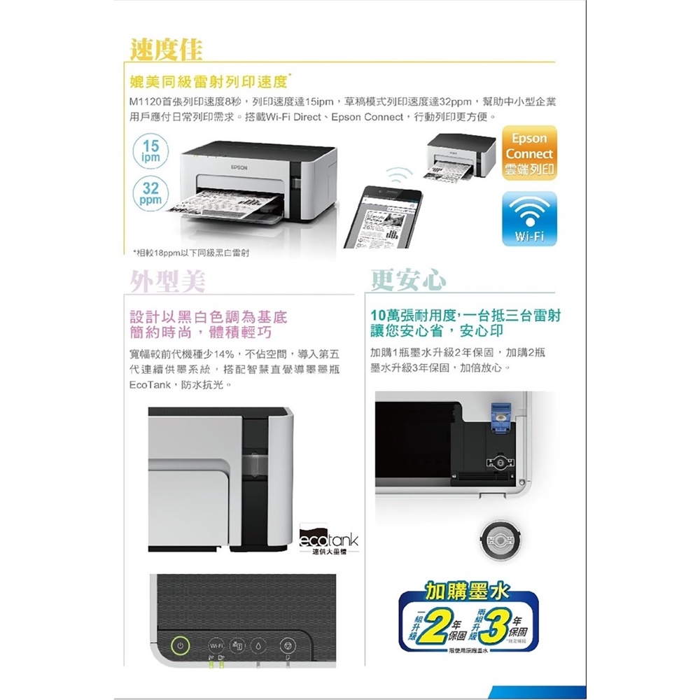 EPSON M1120 黑白 高速 Wifi 連續供墨 印表機 綠風潮