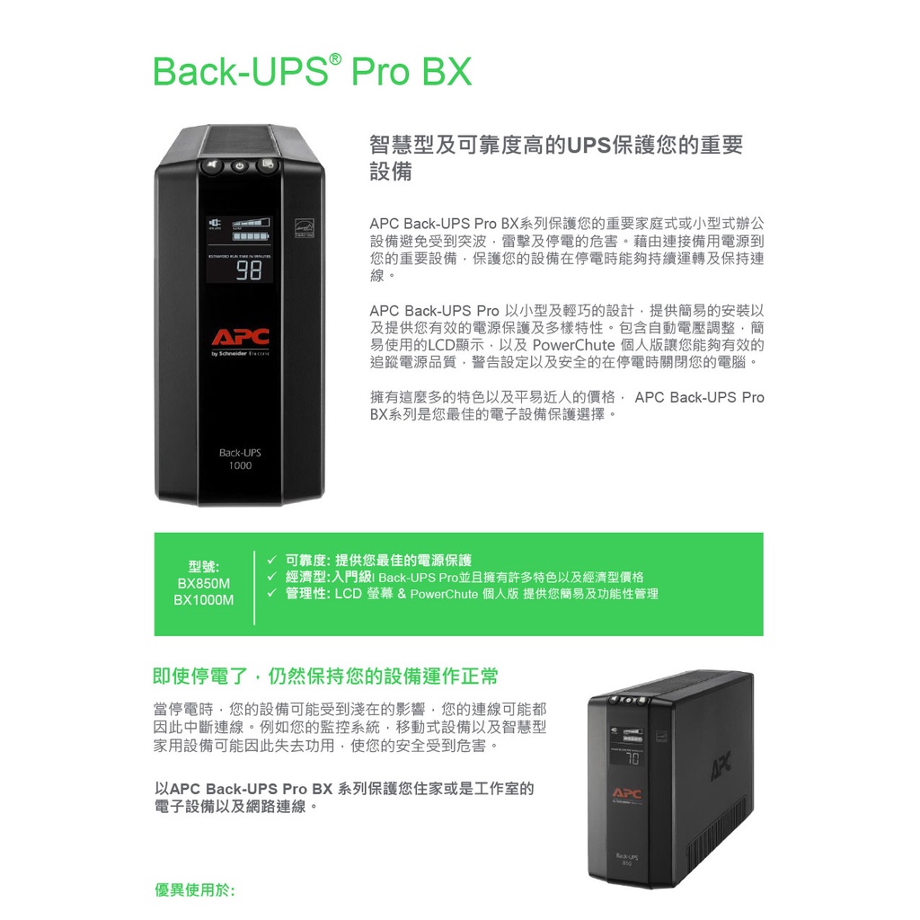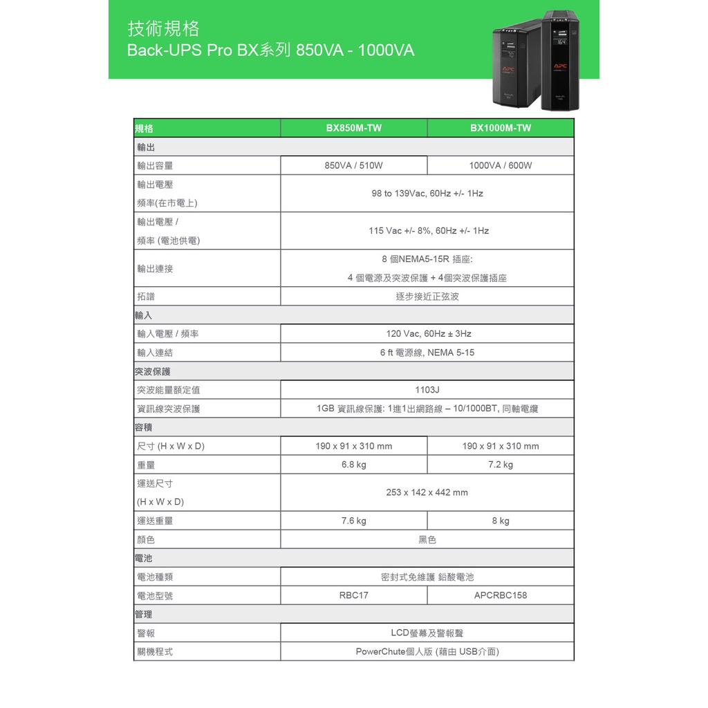 APC BX850M-TW 在線互動式UPS 850VA/510W 綠風潮