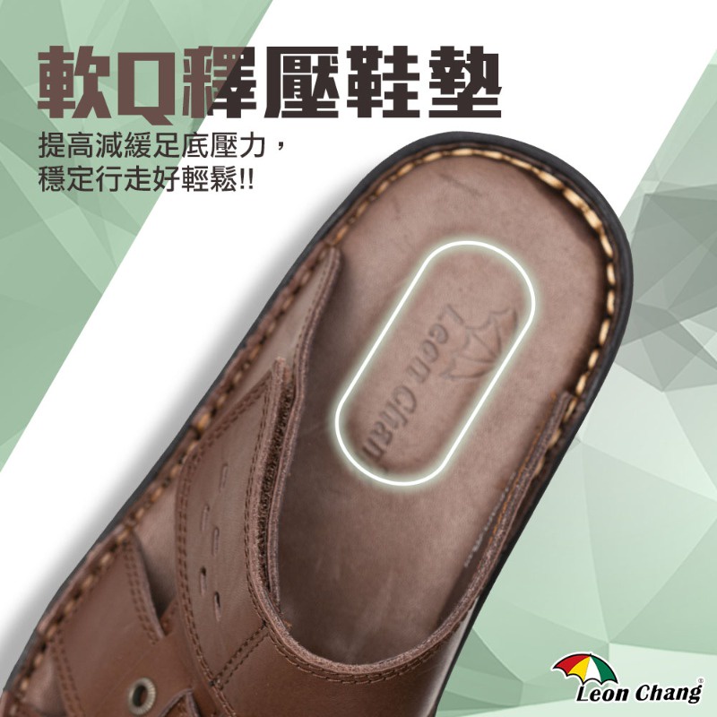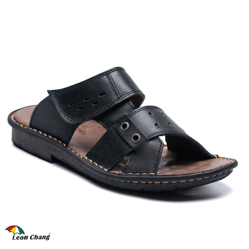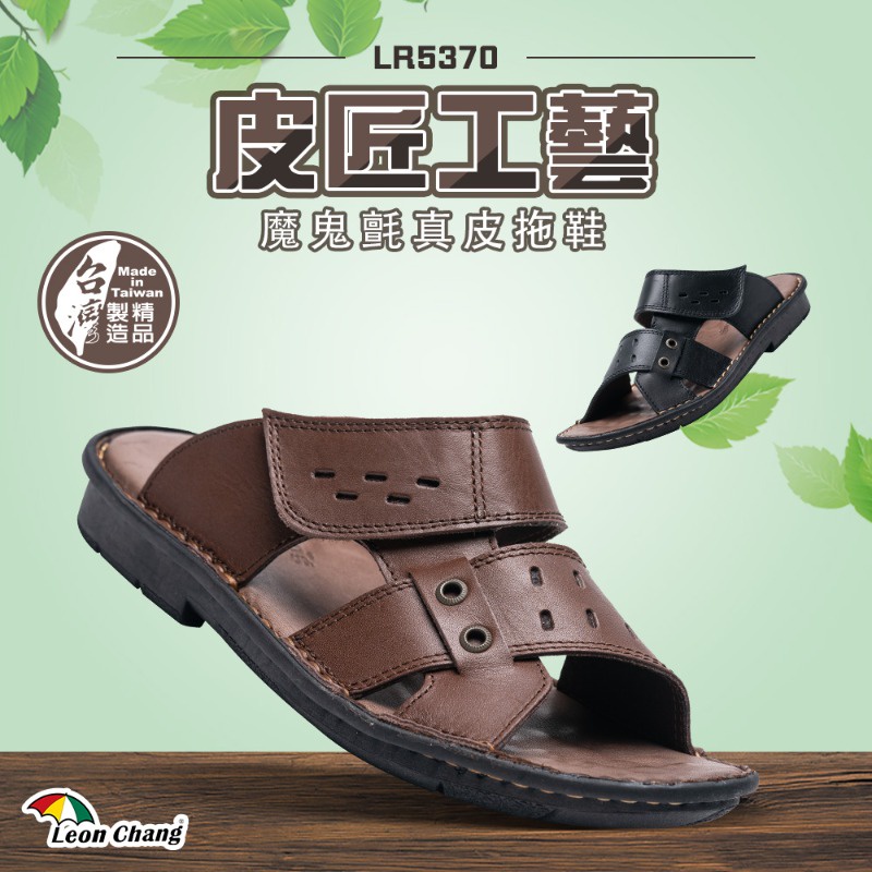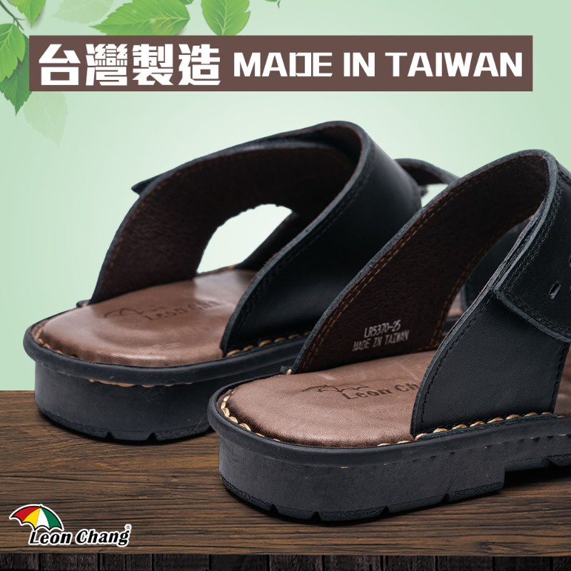 【Leon Chang 雨傘】男款-皮匠工藝魔鬼氈真皮拖鞋-黑