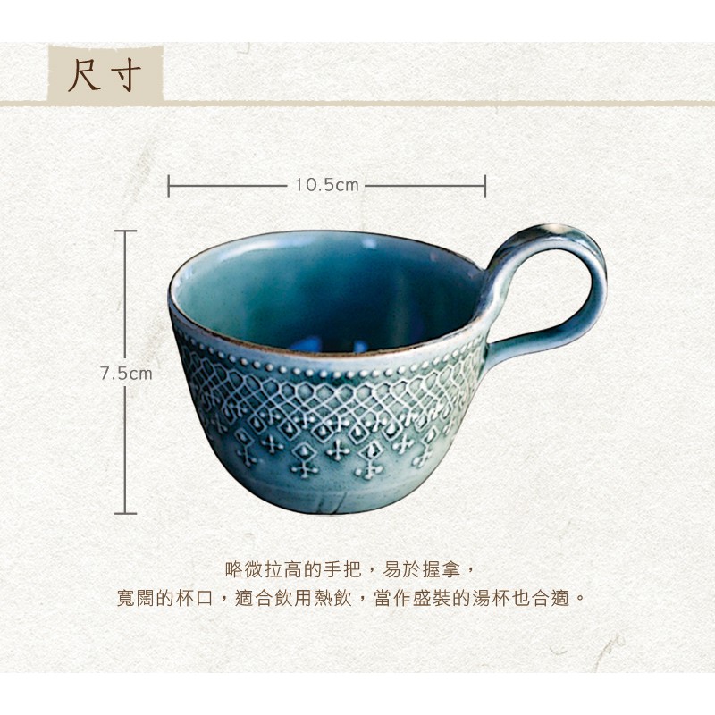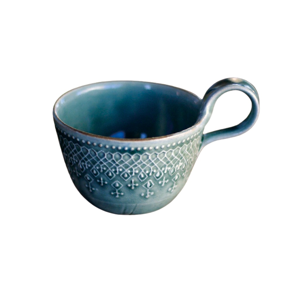 日本益子燒 - 蕾絲花紋提耳杯 - 灰綠 - 日本現貨