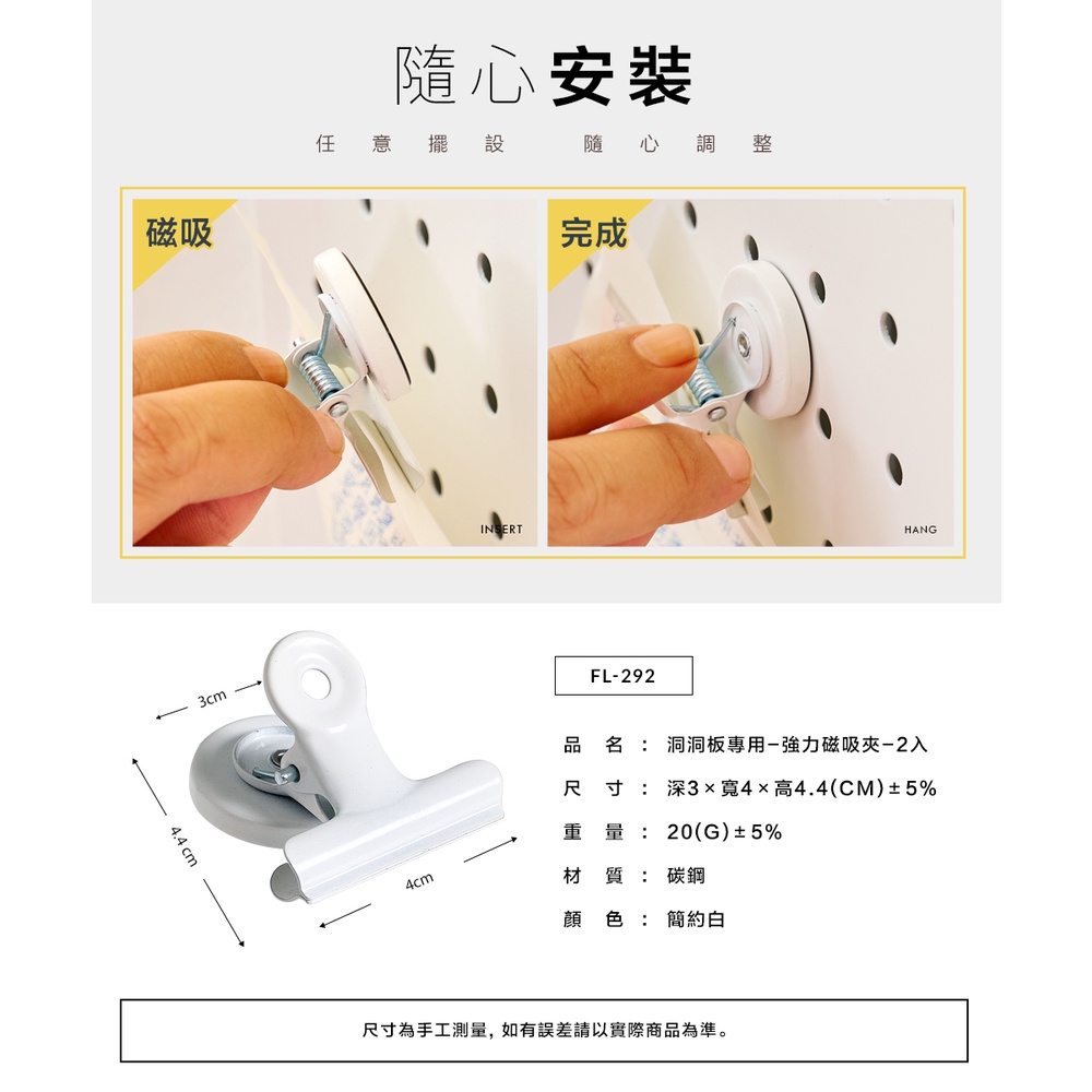 【FL生活+】洞洞板專用配件-洞洞板專用-強力磁吸夾-2入(FL-292) 牆面收納 牆面裝飾 洞洞板配件 掛勾