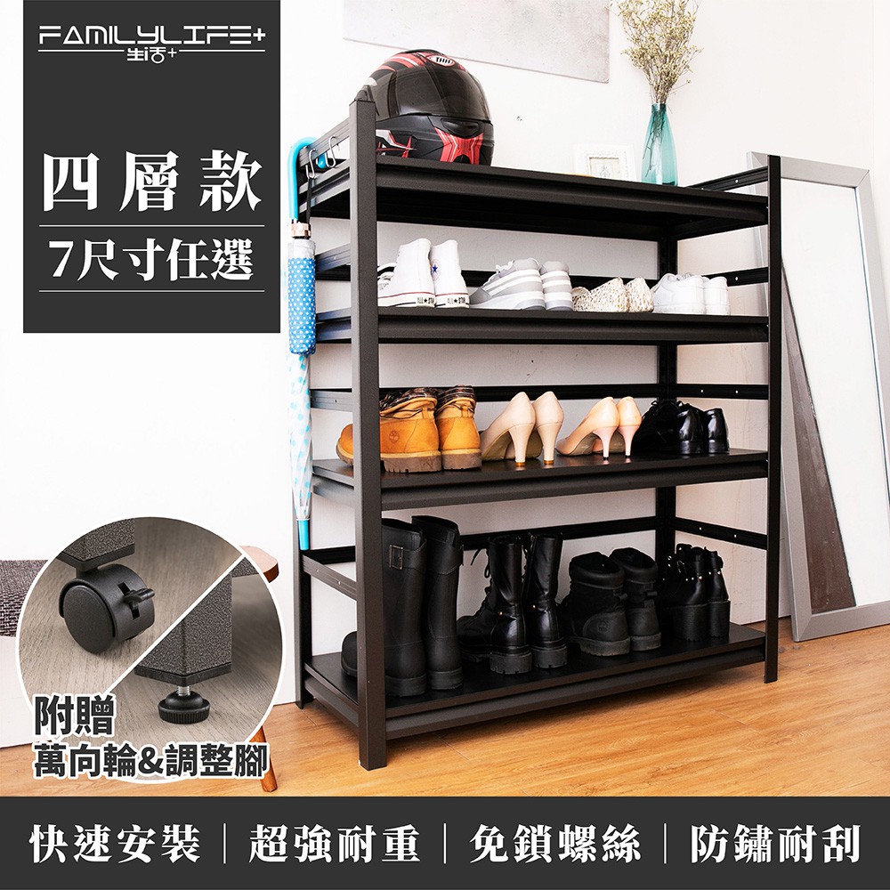【FL生活+】快裝式岩熔碳鋼四層耐重置物架系列 7種尺寸任選 角鋼架 鐵架 貨架 鐵力士架 黑色角鋼層架 陳列架 層櫃