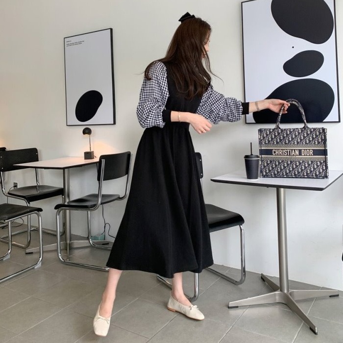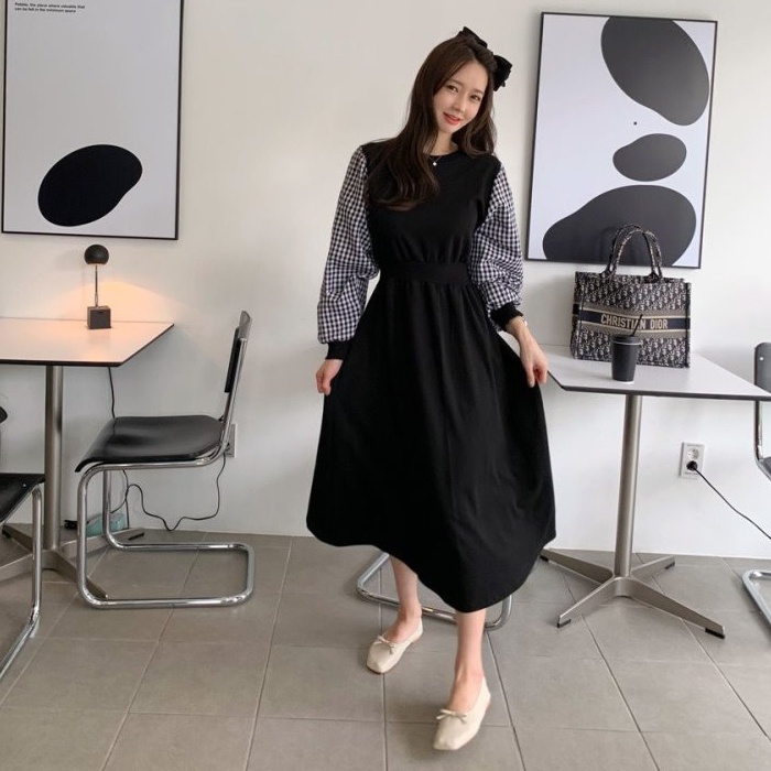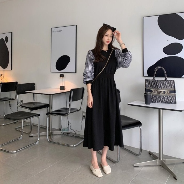 【白鳥麗子】韓國製 復古格紋收腰抓皺高腰公主袖洋裝
