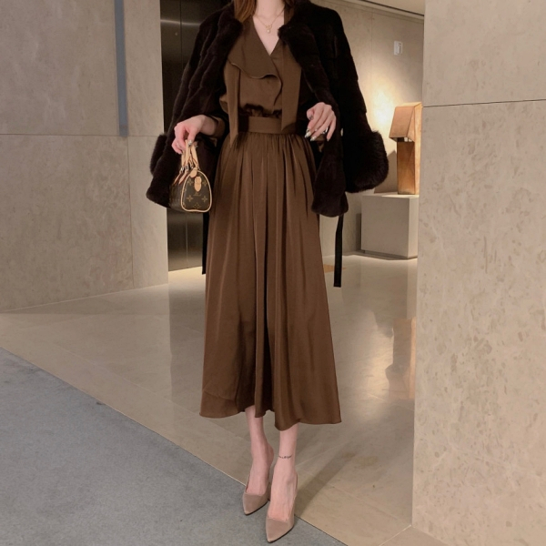白鳥麗子 [現貨快出] 連身裙 優雅光澤感領結收腰泡泡袖長洋裝