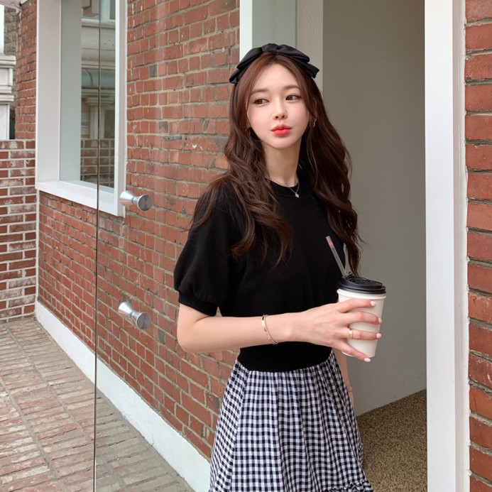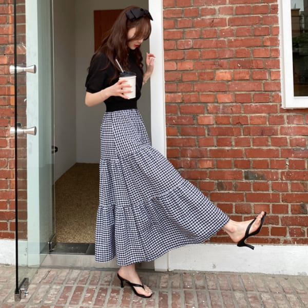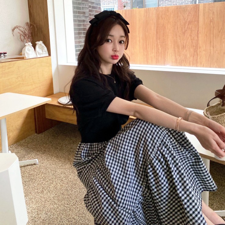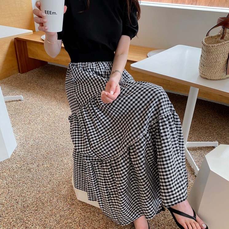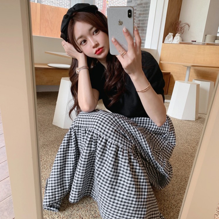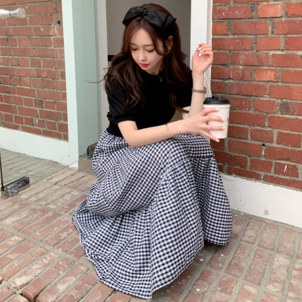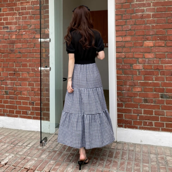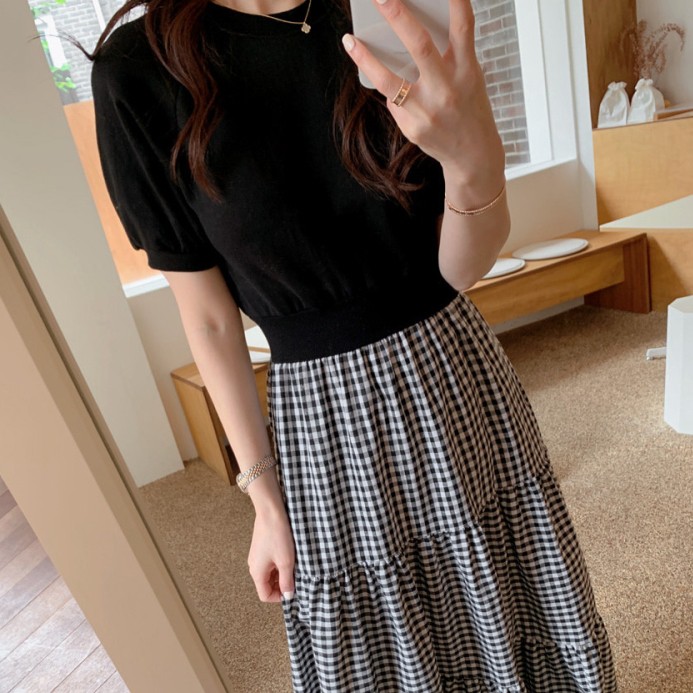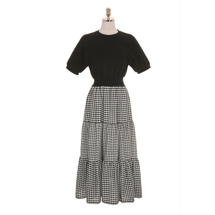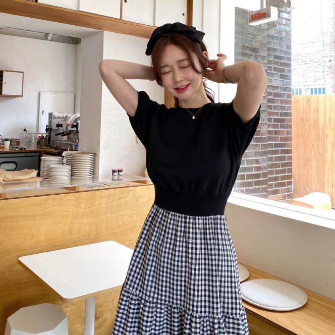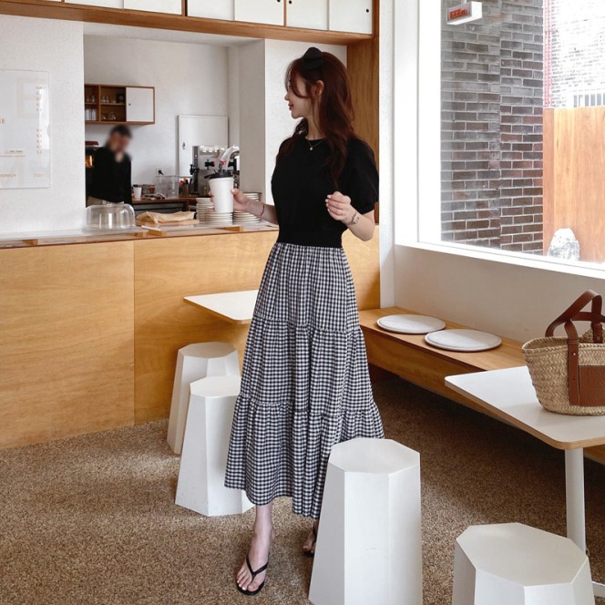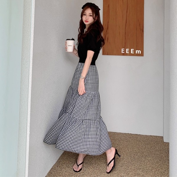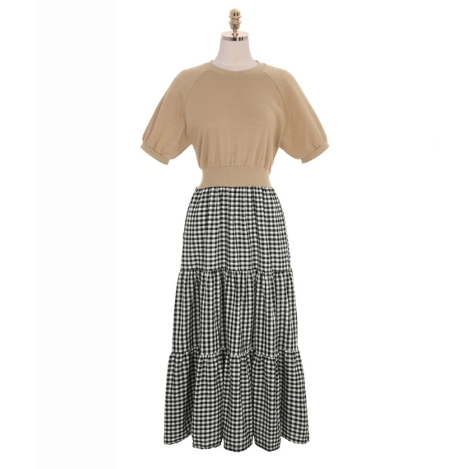 白鳥麗子 韓國製 經典假兩件收腰拼接格紋百褶蛋糕飄逸洋裝