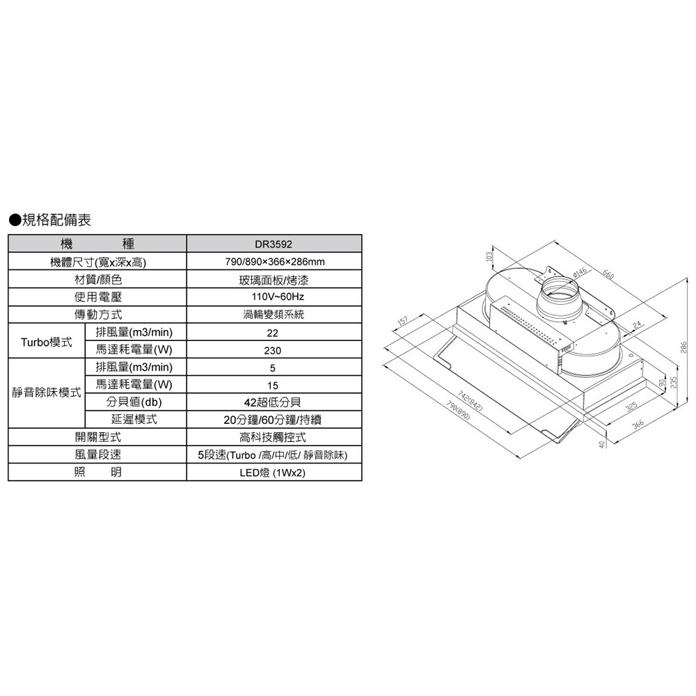 【SAKURA櫻花】觸控隱藏型除油煙機 - 渦輪變頻系列 DR-3592AL