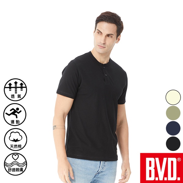 BVD 竹節棉半門襟短袖T恤 亨利領 四色可選(丈青 米白 黑 軍綠)