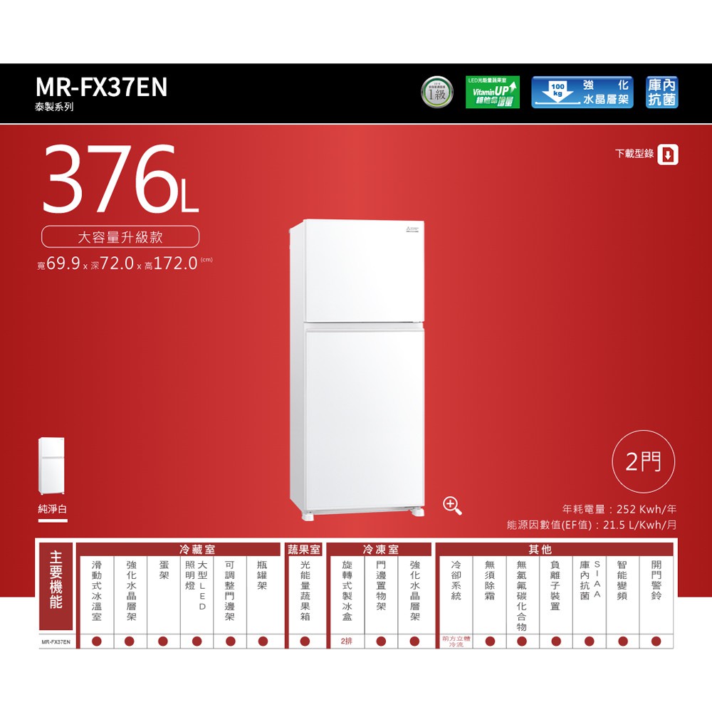 【MITSUBISHI 三菱】376L 泰製雙門變頻電冰箱 純淨白 MR-FX37EN-GWH (送基本安裝)