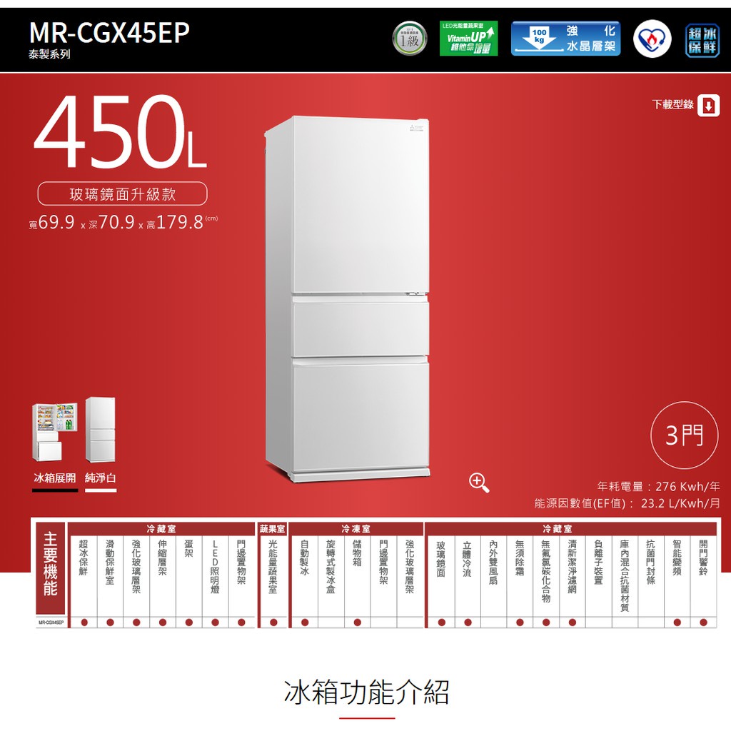 【MITSUBISHI 三菱】450L 泰製三門變頻電冰箱 純淨白 MR-CGX45EP-GWH-C (送基本安裝)