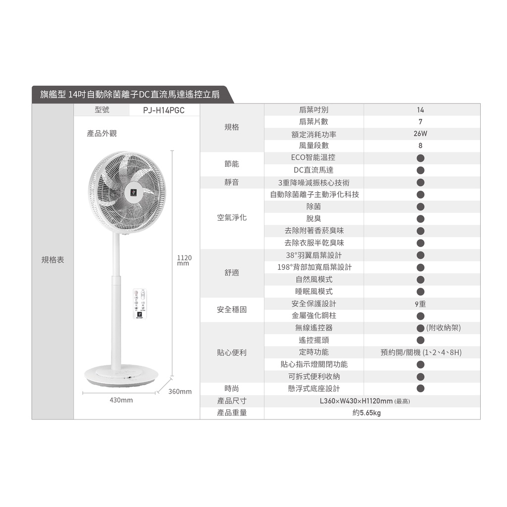 【SHARP 夏普】14吋PJ-H14PGC 自動除菌離子DC直流遙控立扇