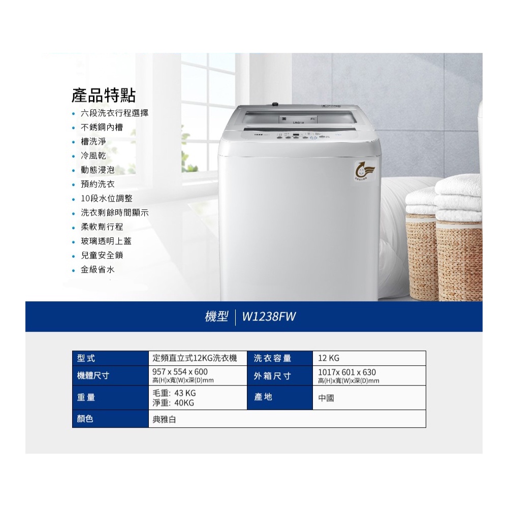 TECO東元 12公斤定頻直立式洗衣機 W1238FW (含基本安裝+舊機回收)