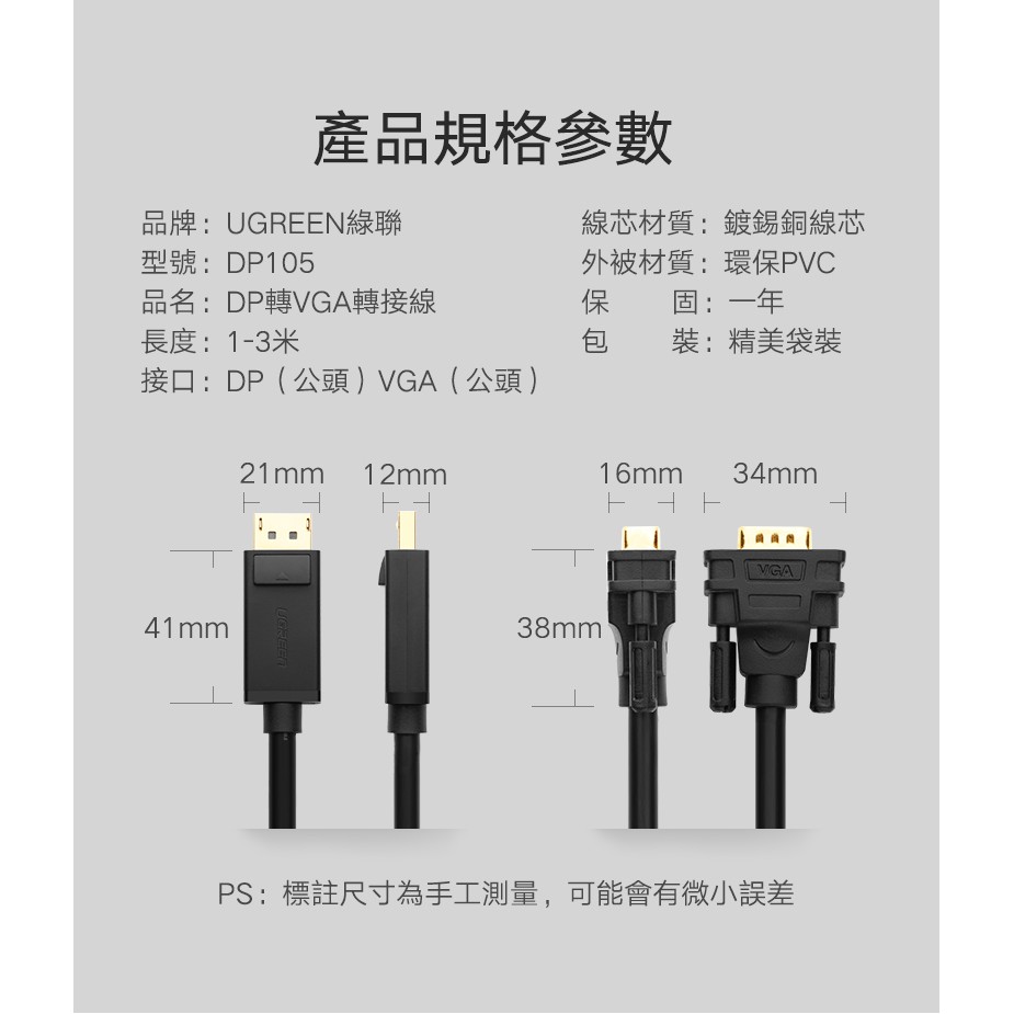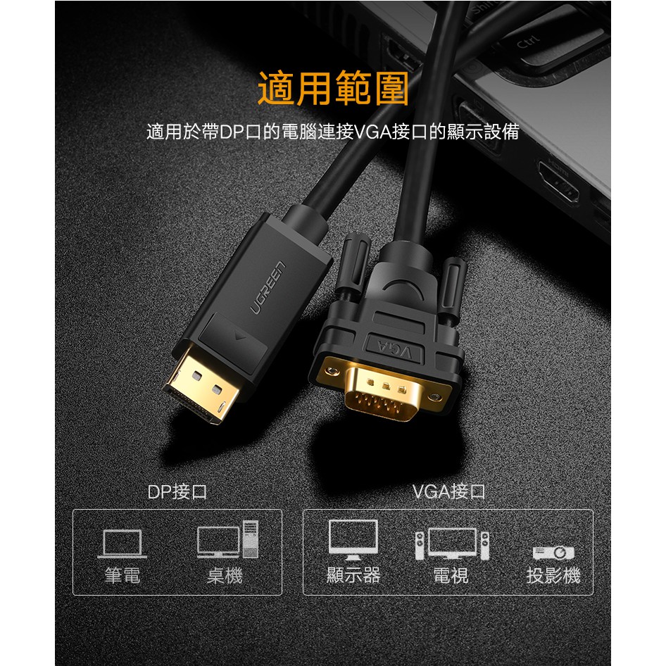 【綠聯】1.5M DP轉VGA傳輸線|公對公|即插即用|雙螢幕擴展|鍍金接頭穩定傳輸|現貨|隔日到貨