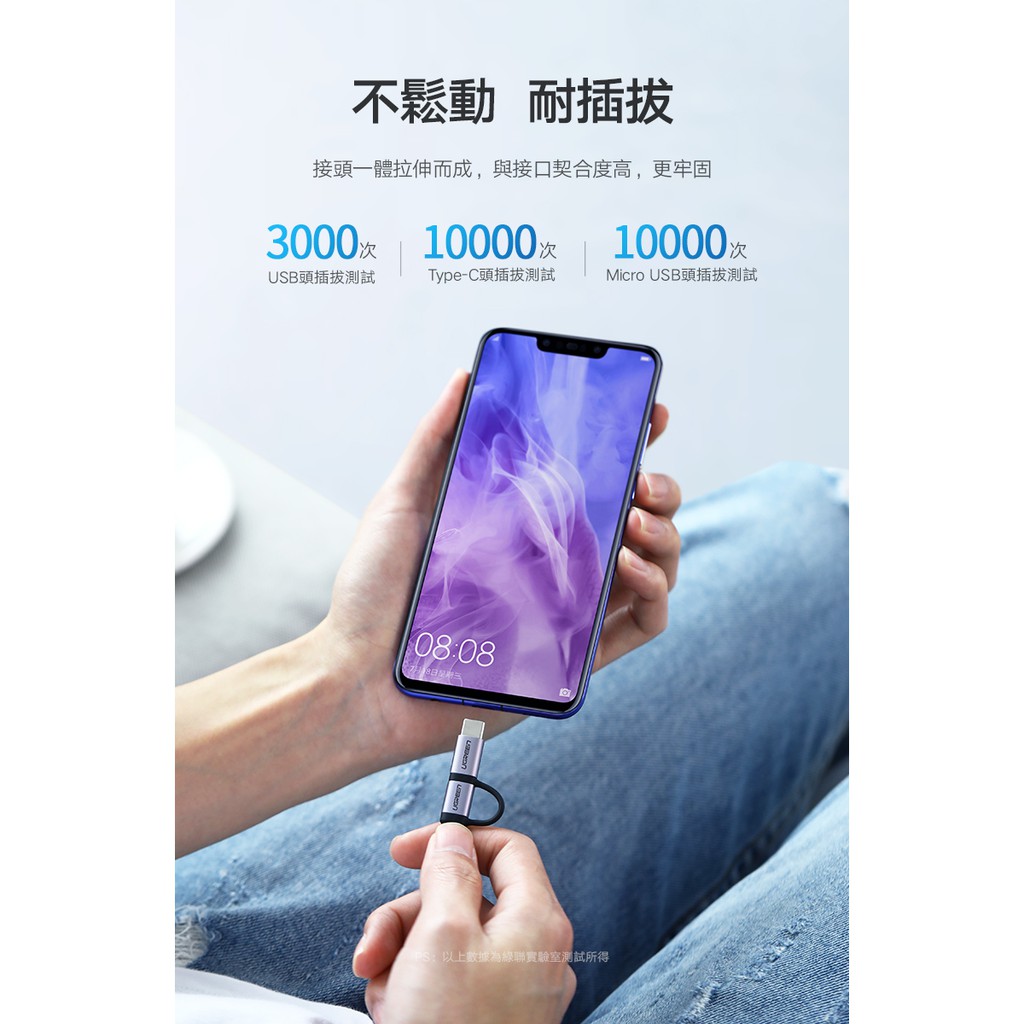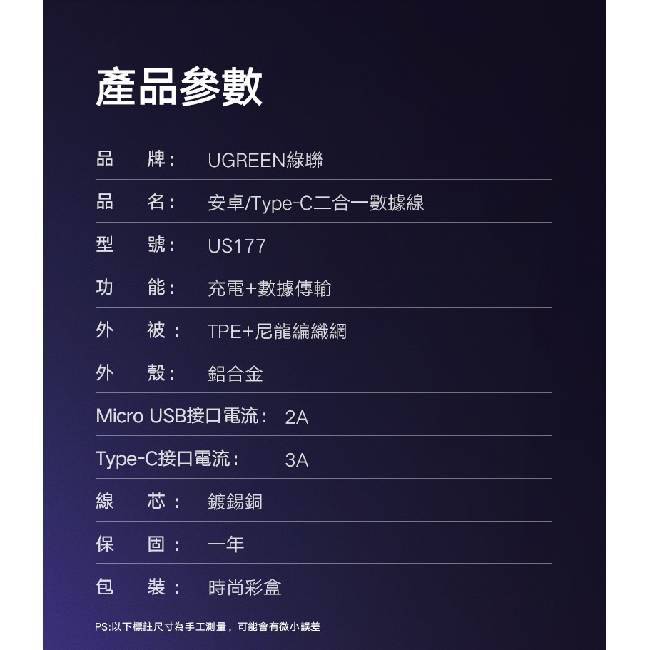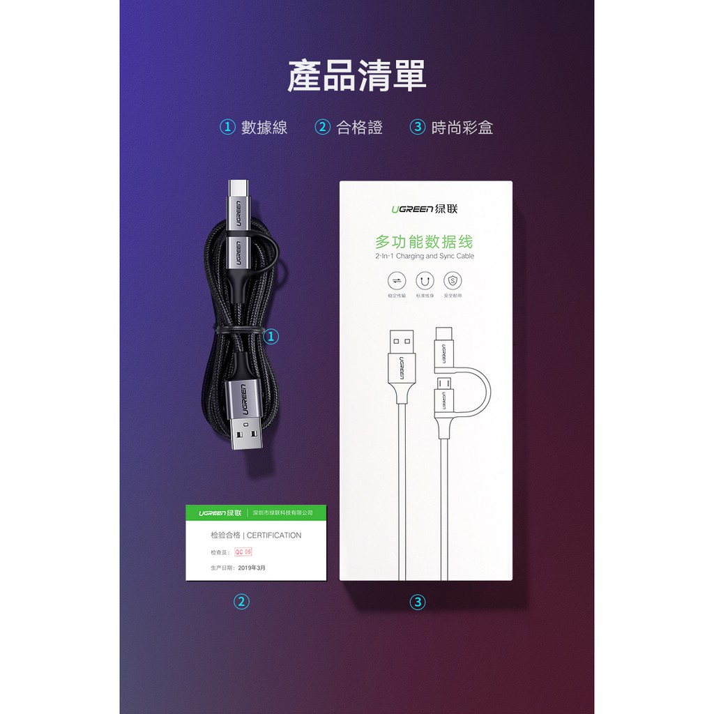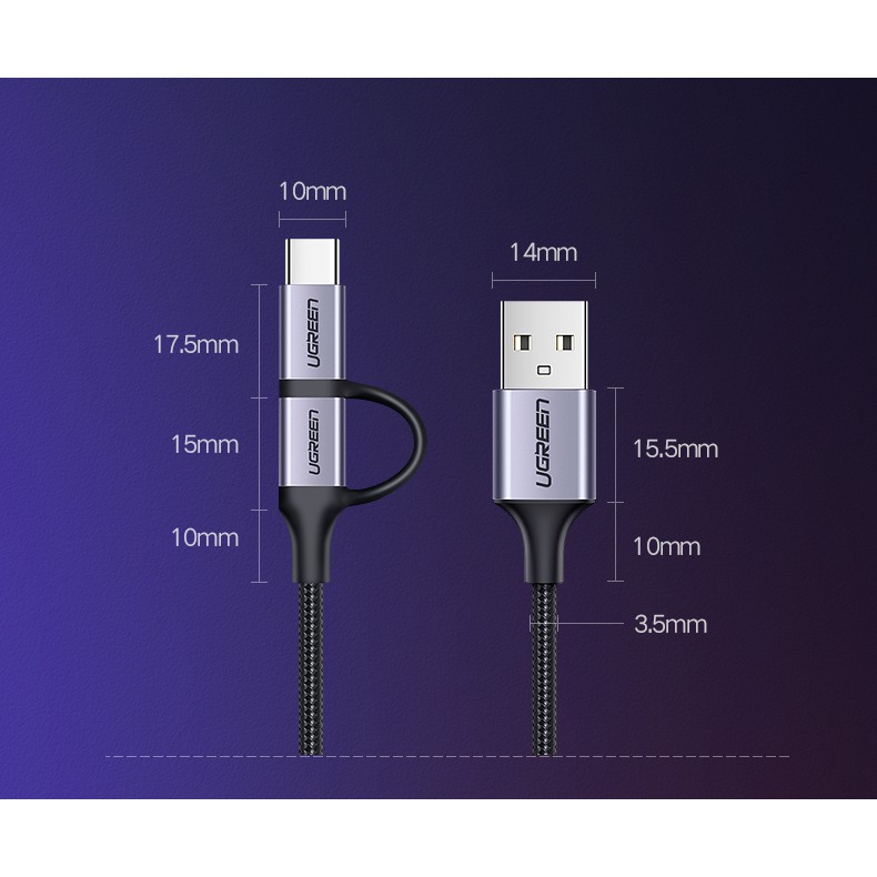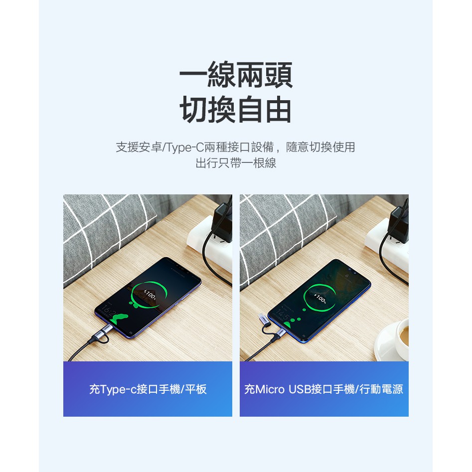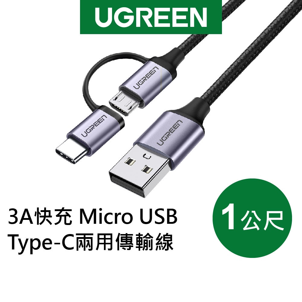 【綠聯】USB-A to Type C/Micro USB 充電線|1公尺|1頭2用|3A電流|金屬編織版