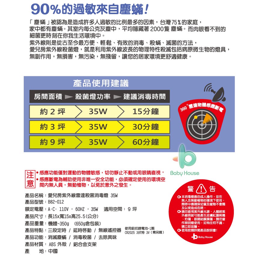 BABY HOUSE 愛兒房雷達紫外線殺菌消毒燈 35W- 360度UVC 紫外線高效殺菌 紫外線殺菌燈 現貨.非水貨