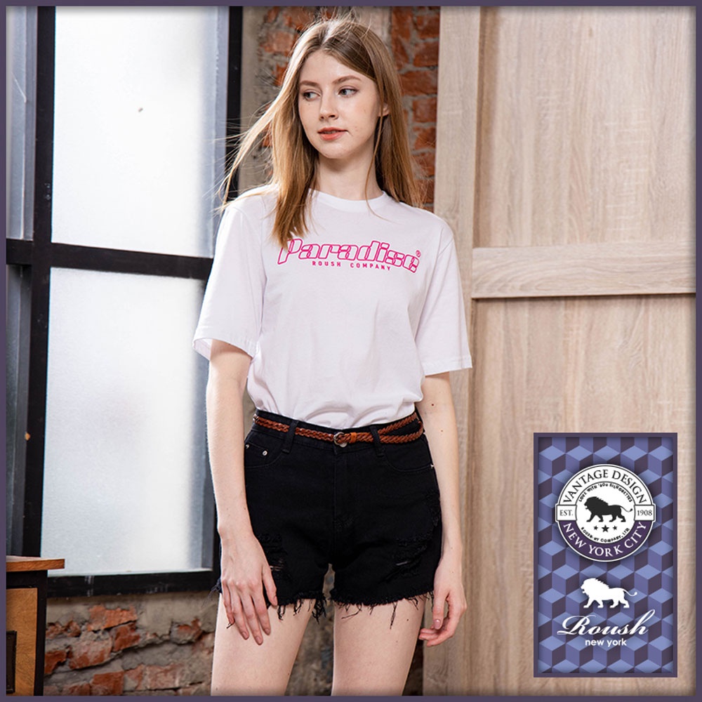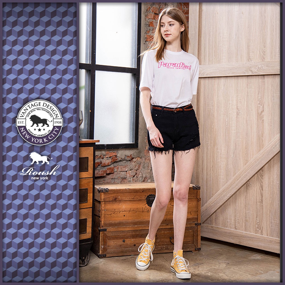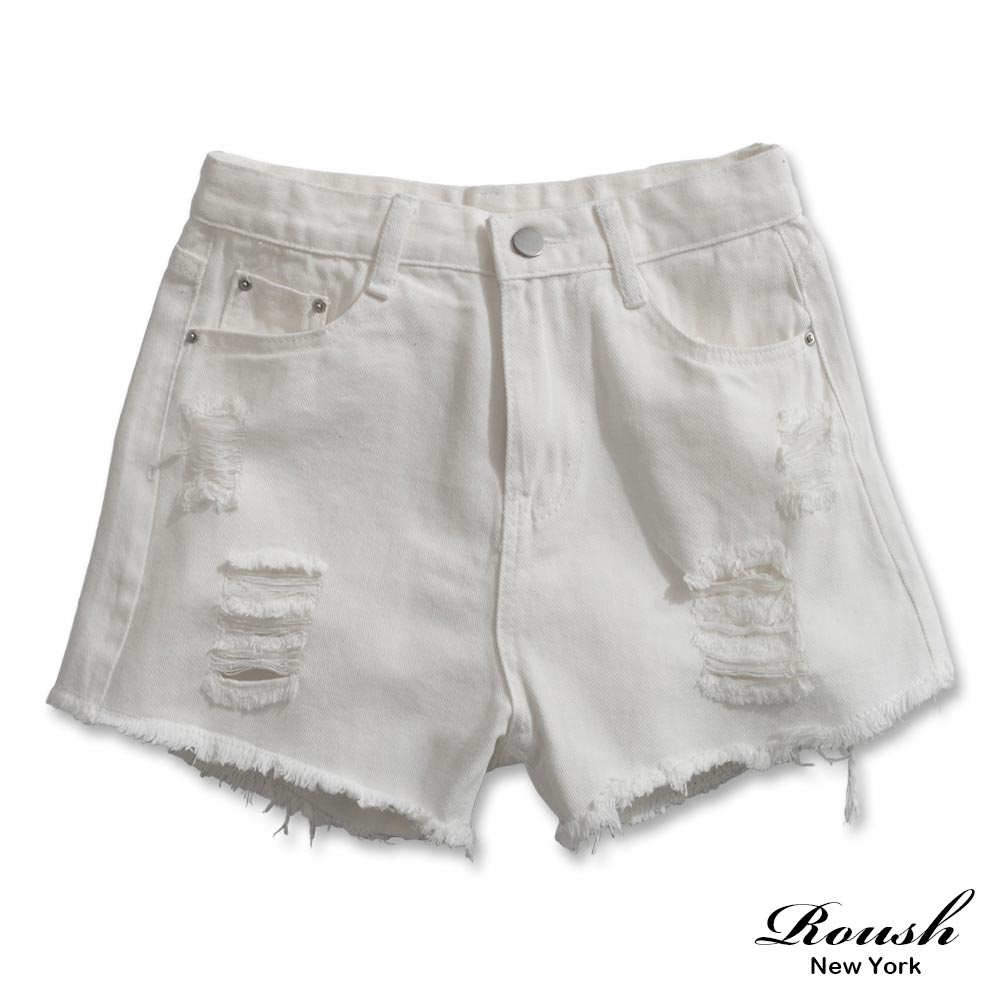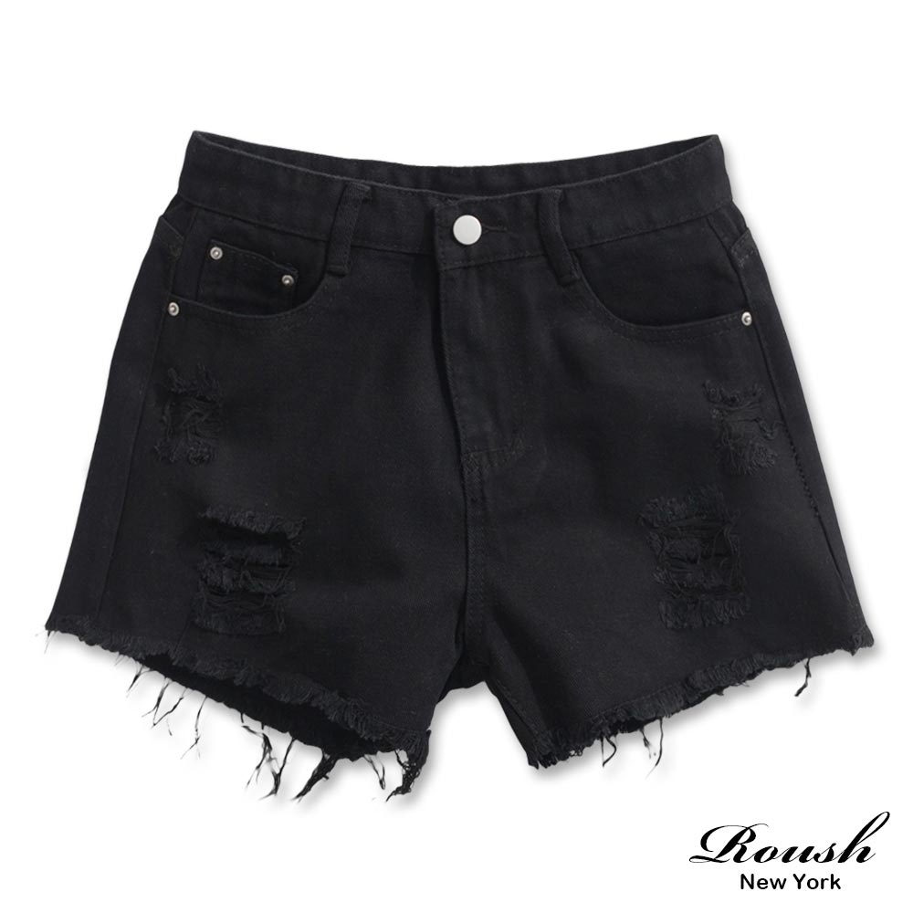 Roush - 女生鬚邊刷破純色牛仔短褲【3128】