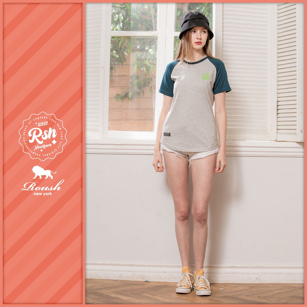Roush - 女生美式膠印拉克蘭袖圓弧短TEE【2110026】