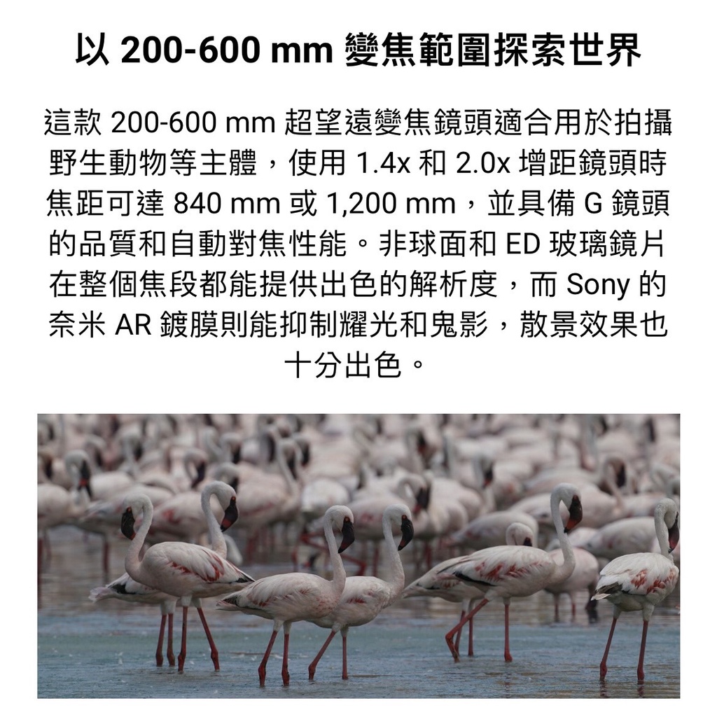 【SONY 索尼】SEL200600G FE 200-600mm F5.6-6.3 G 望遠變焦鏡 (公司貨)