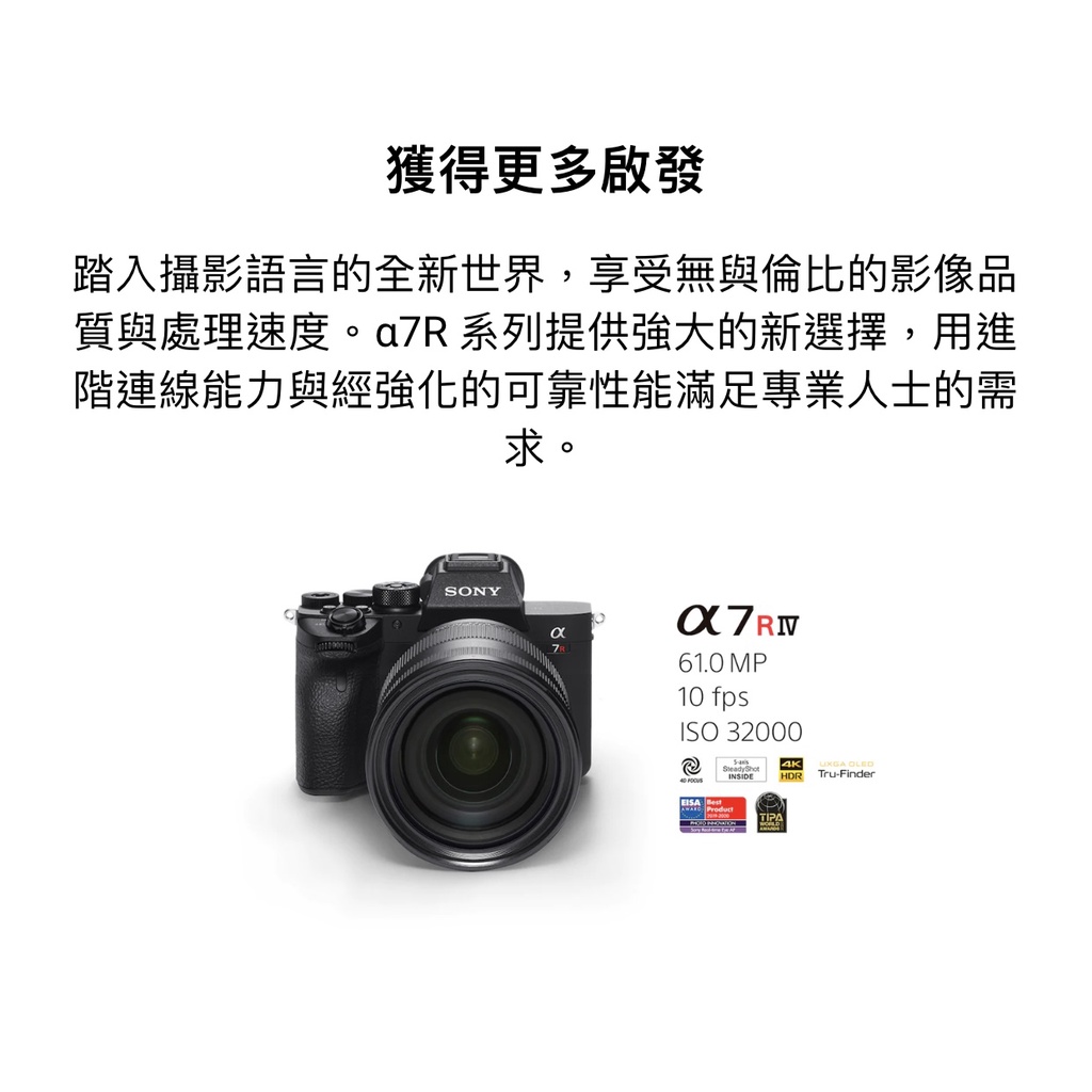 【SONY 索尼】ILCE-7RM4A α7R IV 全片幅 ExmorR™ CMOS感光元件 數位單眼相機 (公司貨)